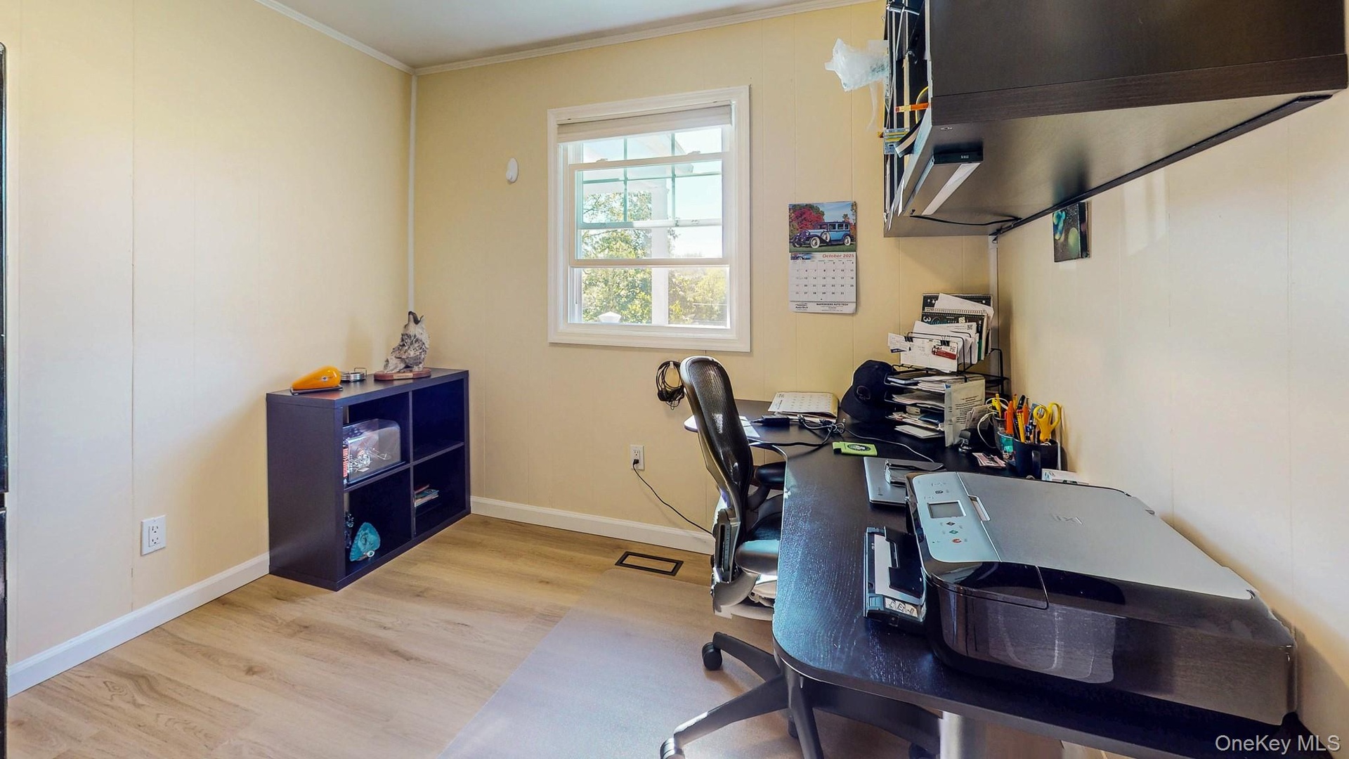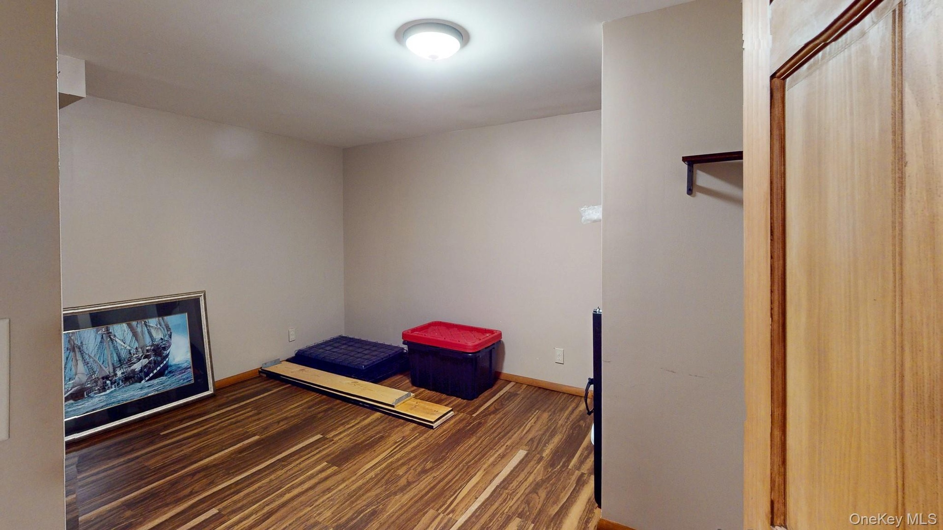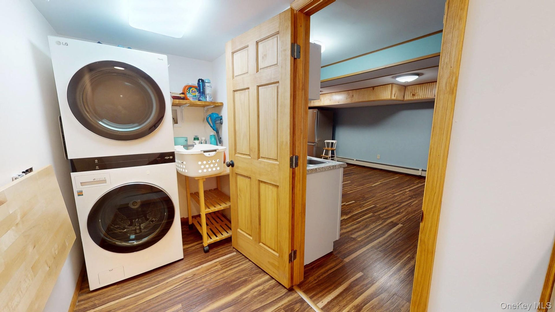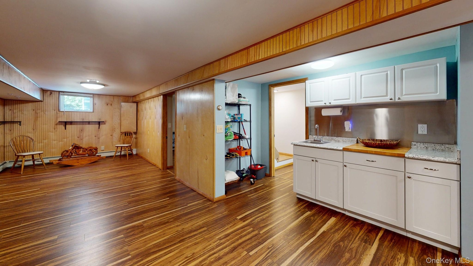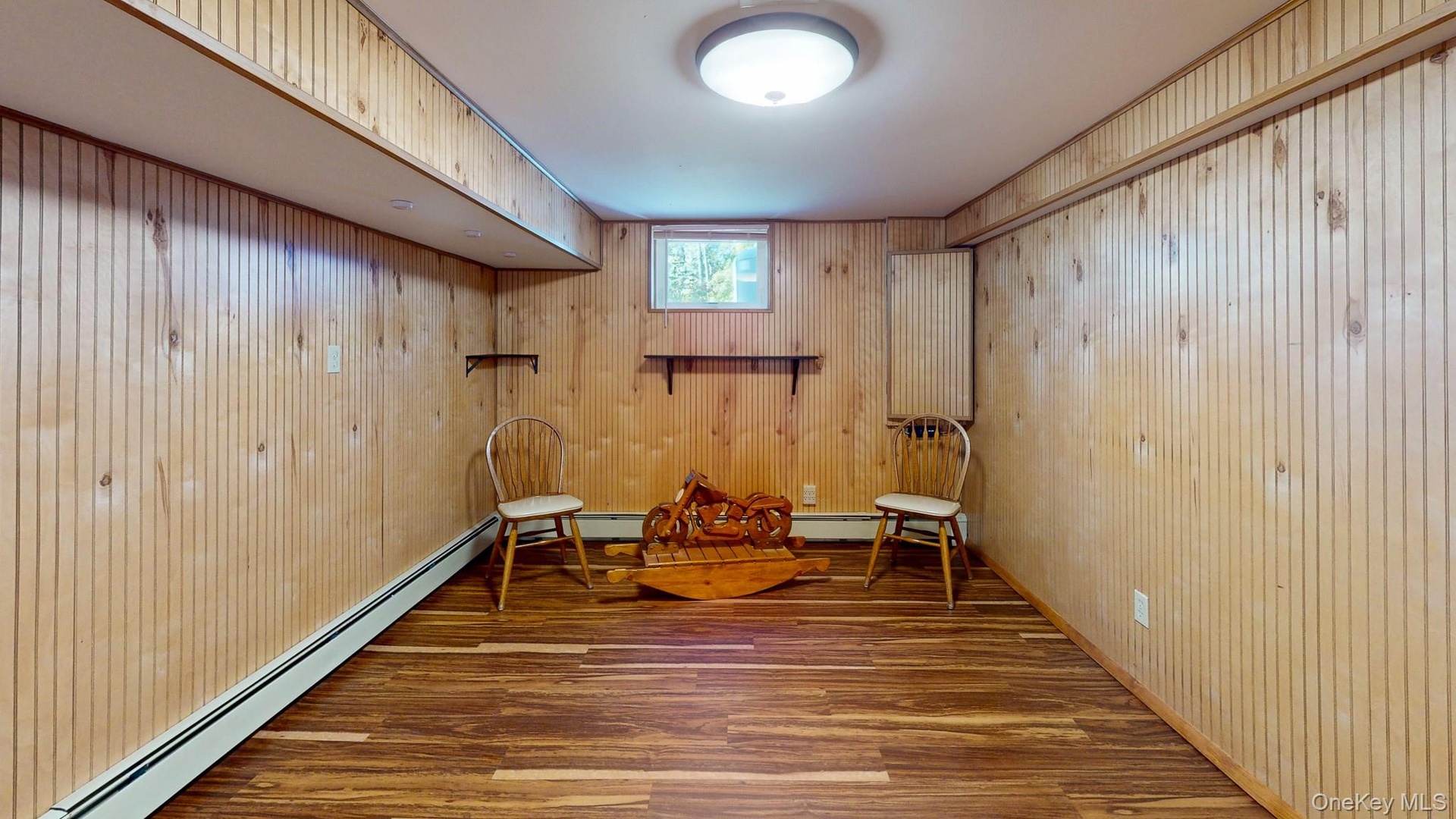 - Lower level sitting room featuring wooden walls, wood finished floors, and a baseboard radiator