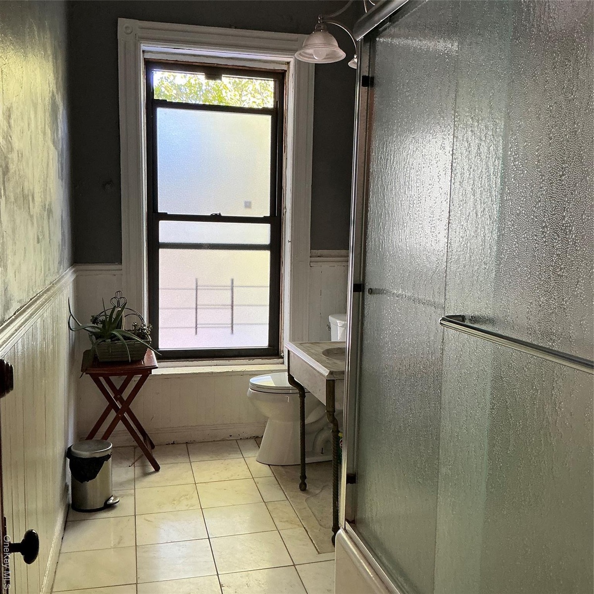 - Full bath featuring a wainscoted wall, a stall shower, and light tile patterned flooring