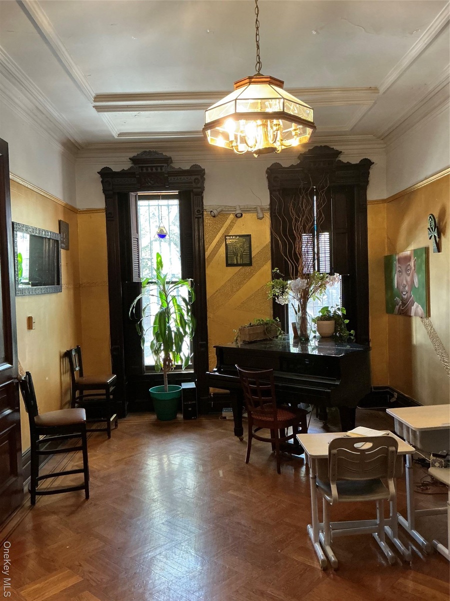 - Main Level Sitting room featuring ornamental molding and a chandelier