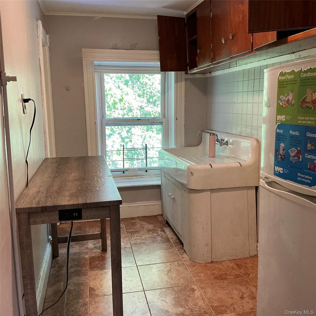 - Kitchen with light tile patterned floors, light countertops, backsplash, open shelves, and freestanding refrigerator