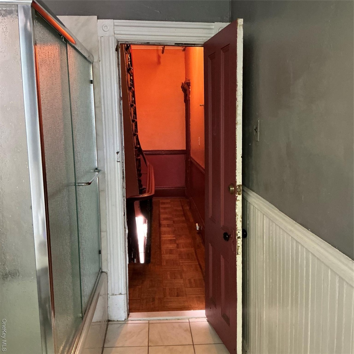 - Bathroom featuring a stall shower, tile patterned floors, and a wainscoted wall