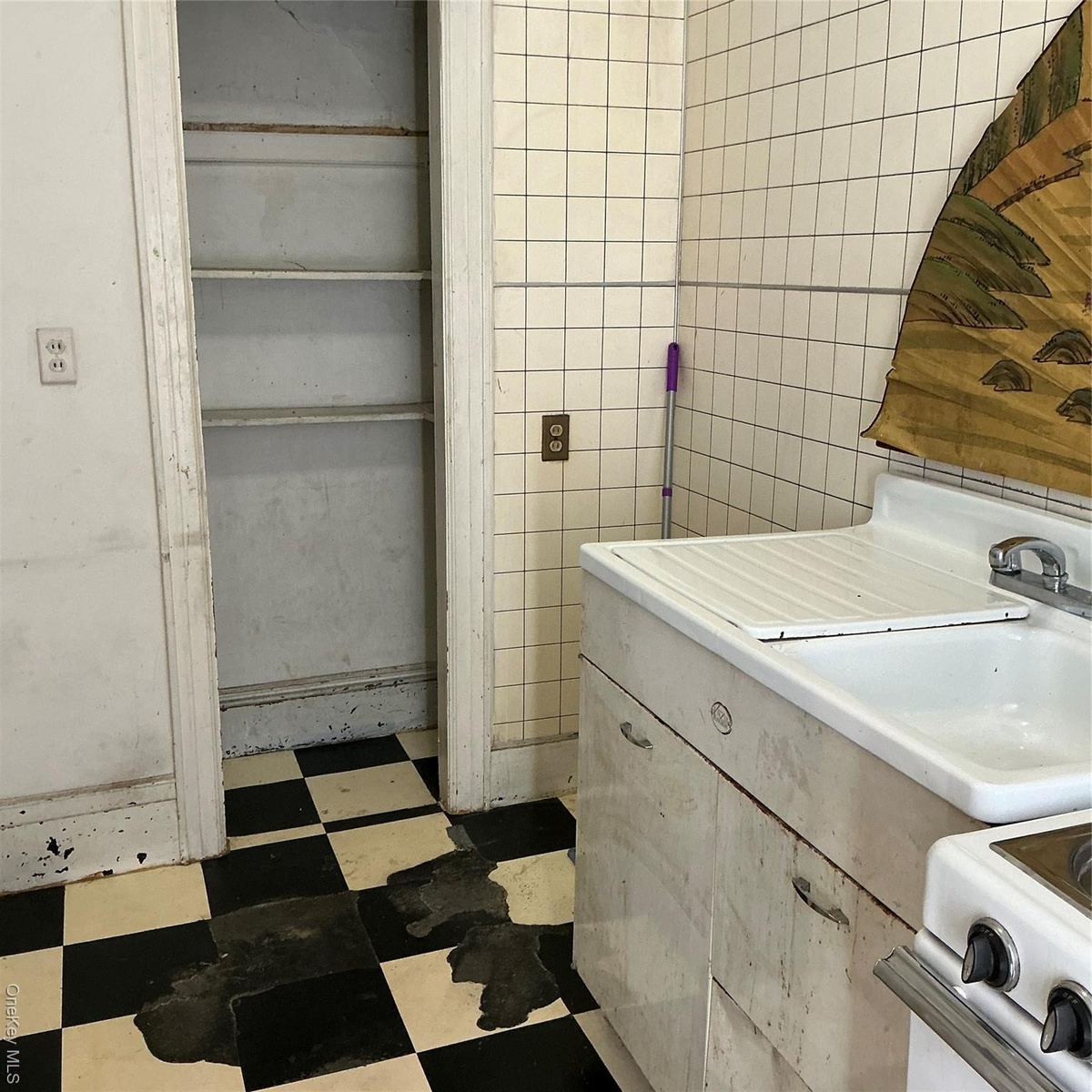 - Dining space featuring washing machine and dryer and light tile patterned flooring
