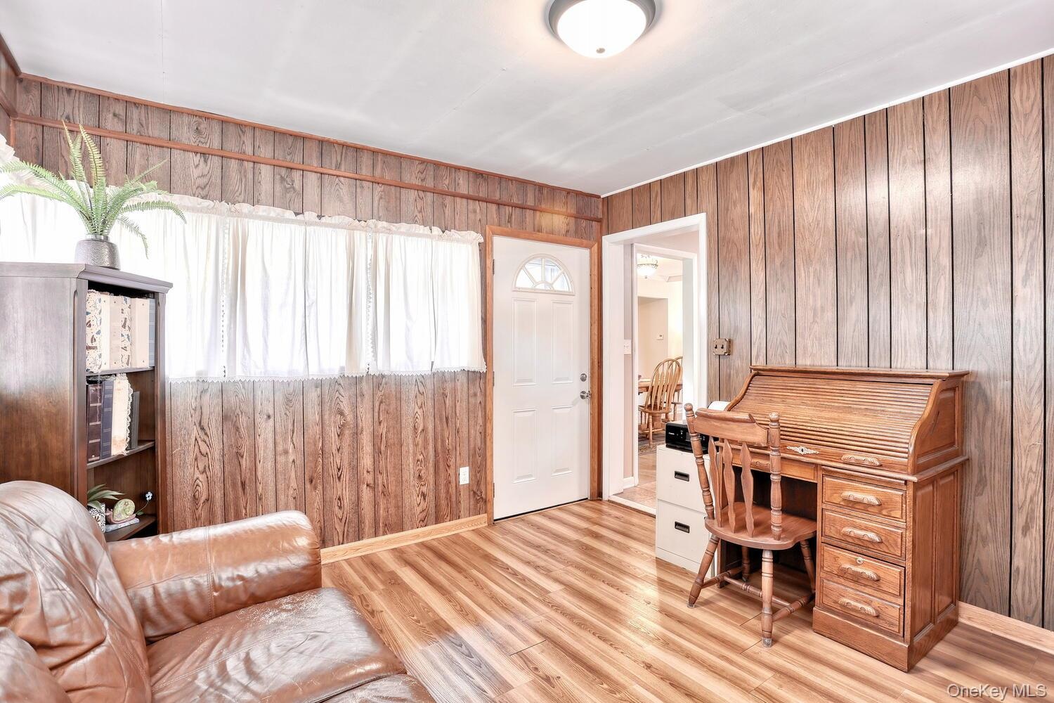 - Living area with wood walls, wood finished floors, and baseboard heating