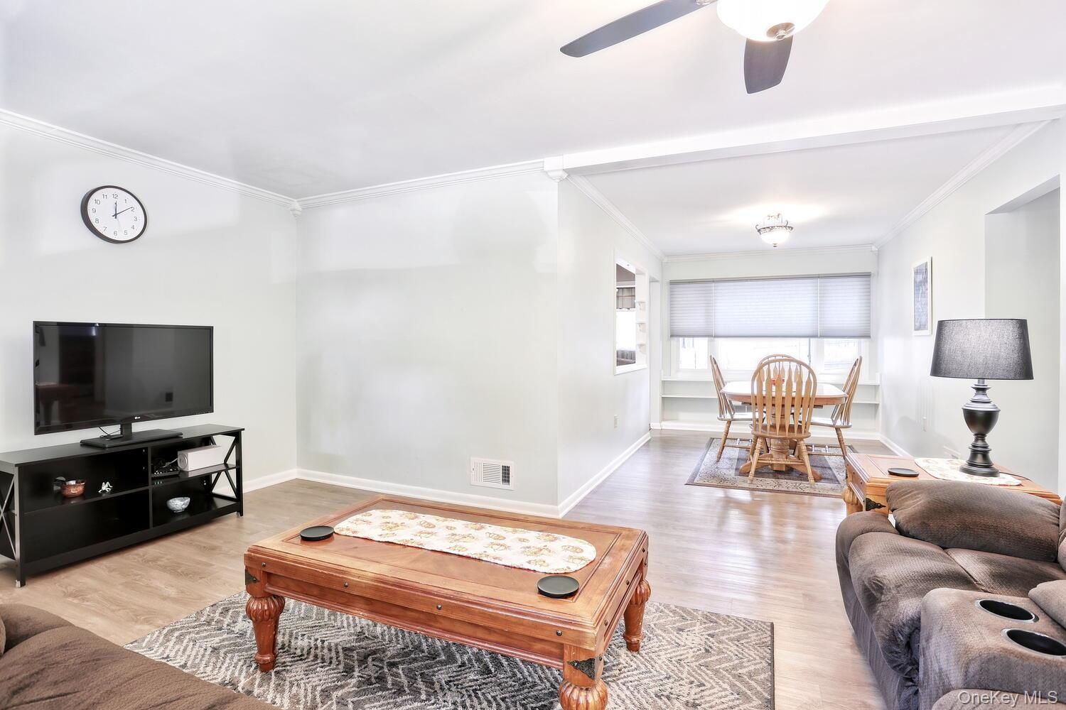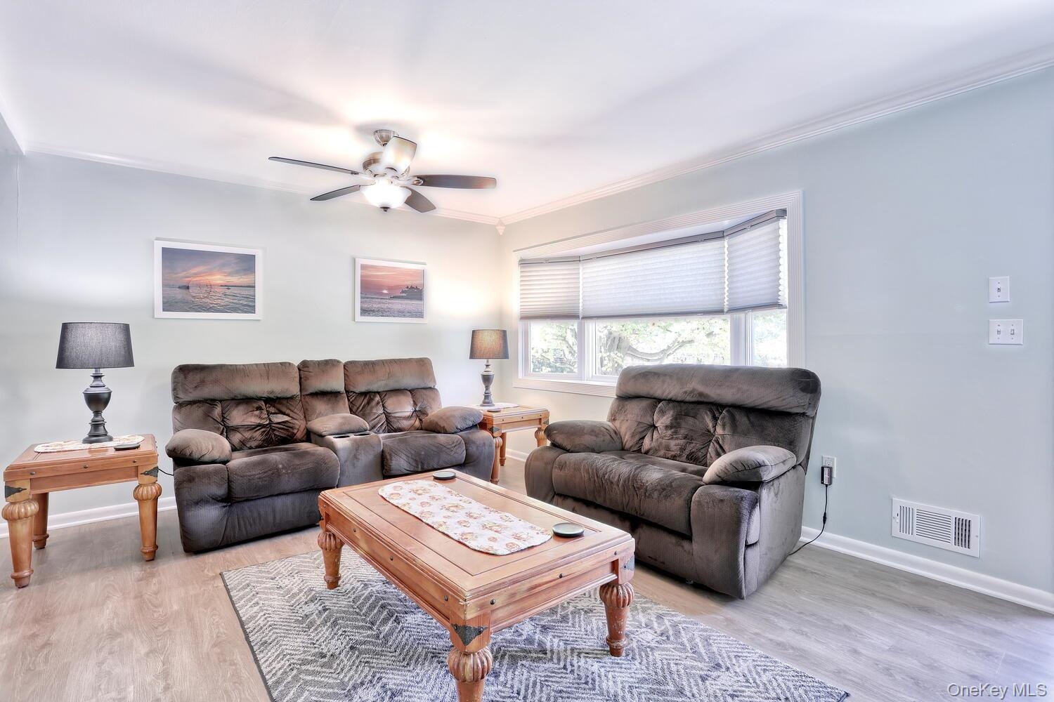 - Living room with ornamental molding, light wood-type flooring, and a ceiling fan