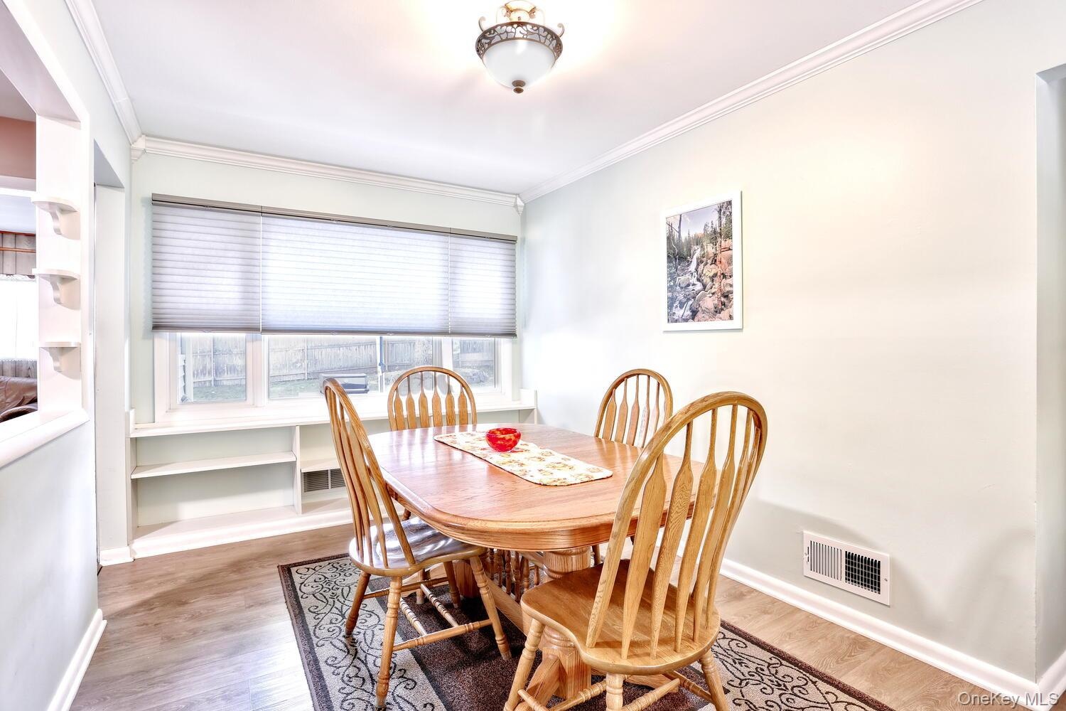 - Dining area with crown molding, light wood-type flooring, and ceiling fan