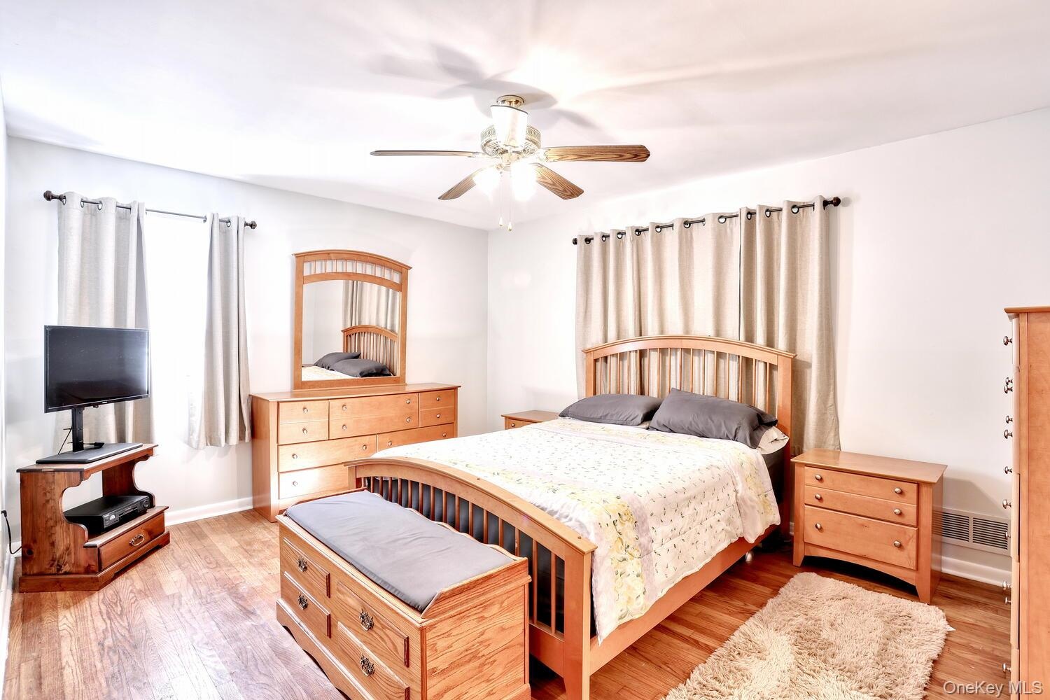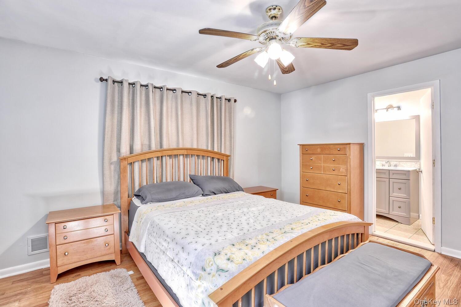 - Bedroom with light wood-type flooring, ceiling fan, and ensuite bath