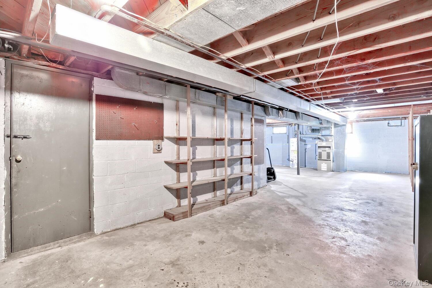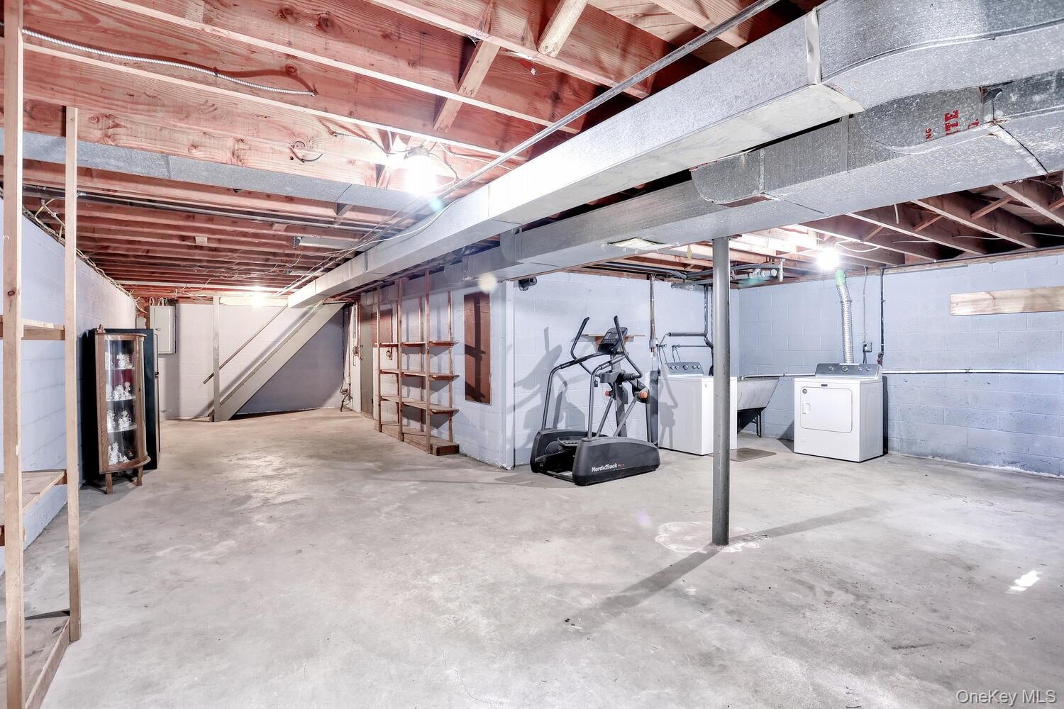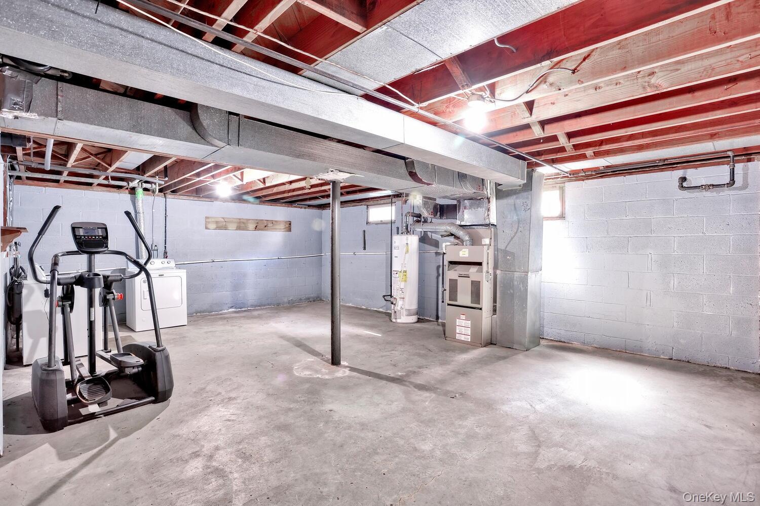 - Unfinished basement with washer / clothes dryer, heating unit, and water heater