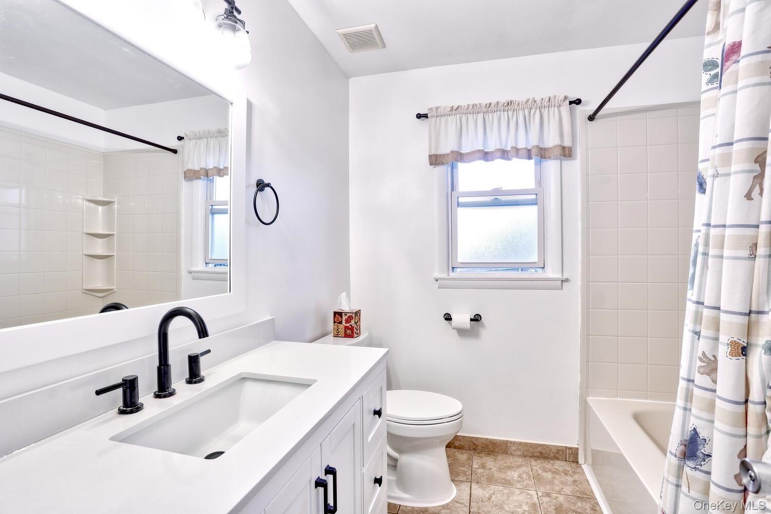 - Bathroom featuring shower / bath combo, vanity, and light tile patterned floors