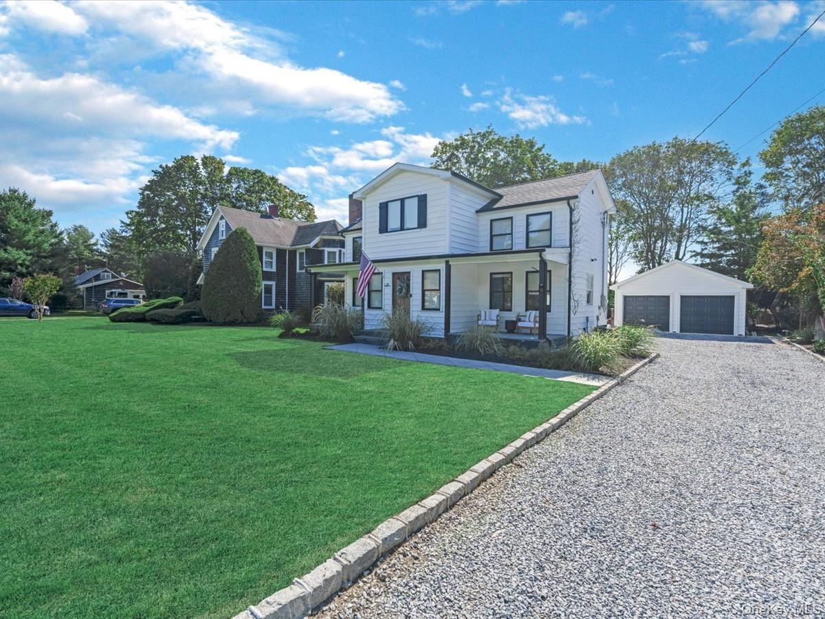 - View of front of house with covered porch, a detached garage, an outdoor structure, and a front yard
