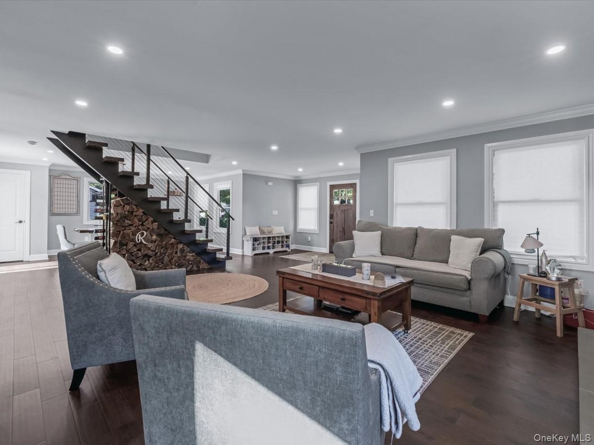 - Living area featuring ornamental molding, stairs, dark wood finished floors, and recessed lighting