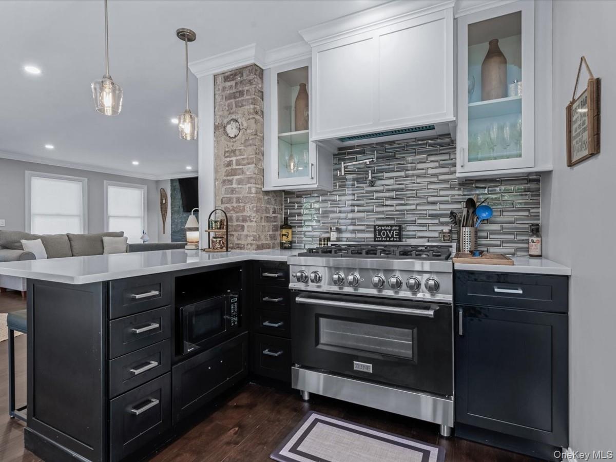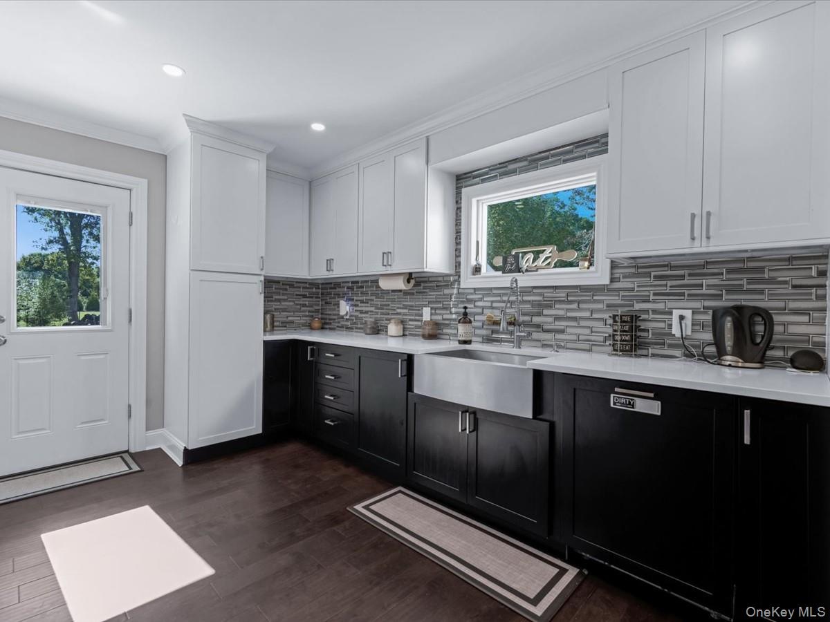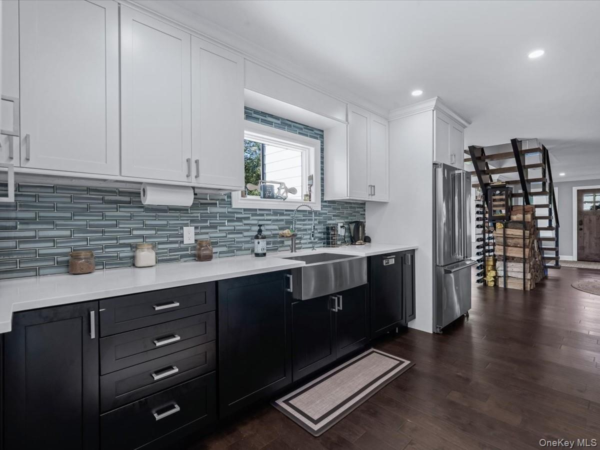 - Kitchen with dark cabinetry, black appliances, backsplash, white cabinets, and dark wood finished floors