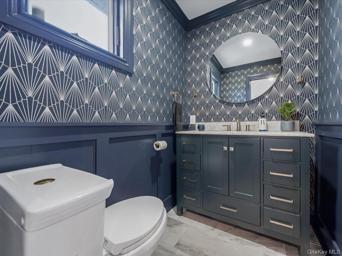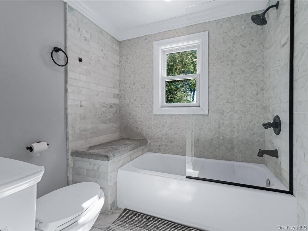 - Bathroom with shower combination, crown molding, vanity, and marble finish flooring