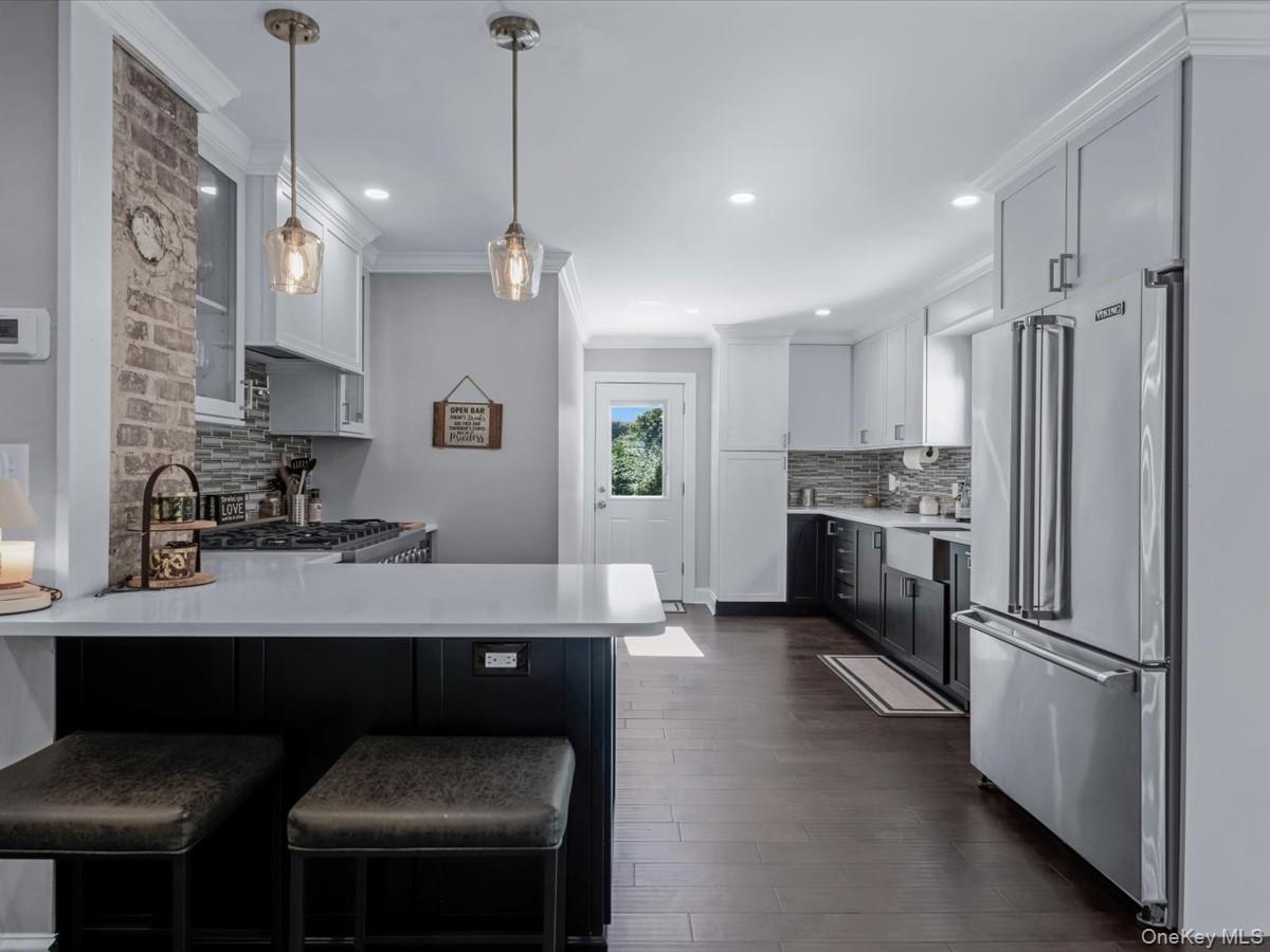 - Kitchen featuring backsplash, high quality fridge, white cabinetry, a peninsula, and pendant lighting
