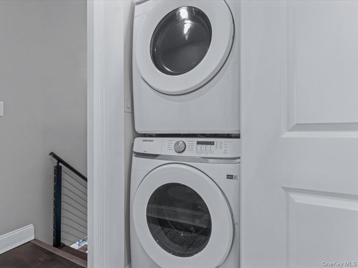 - Laundry room with stacked washer / drying machine and wood finished floors