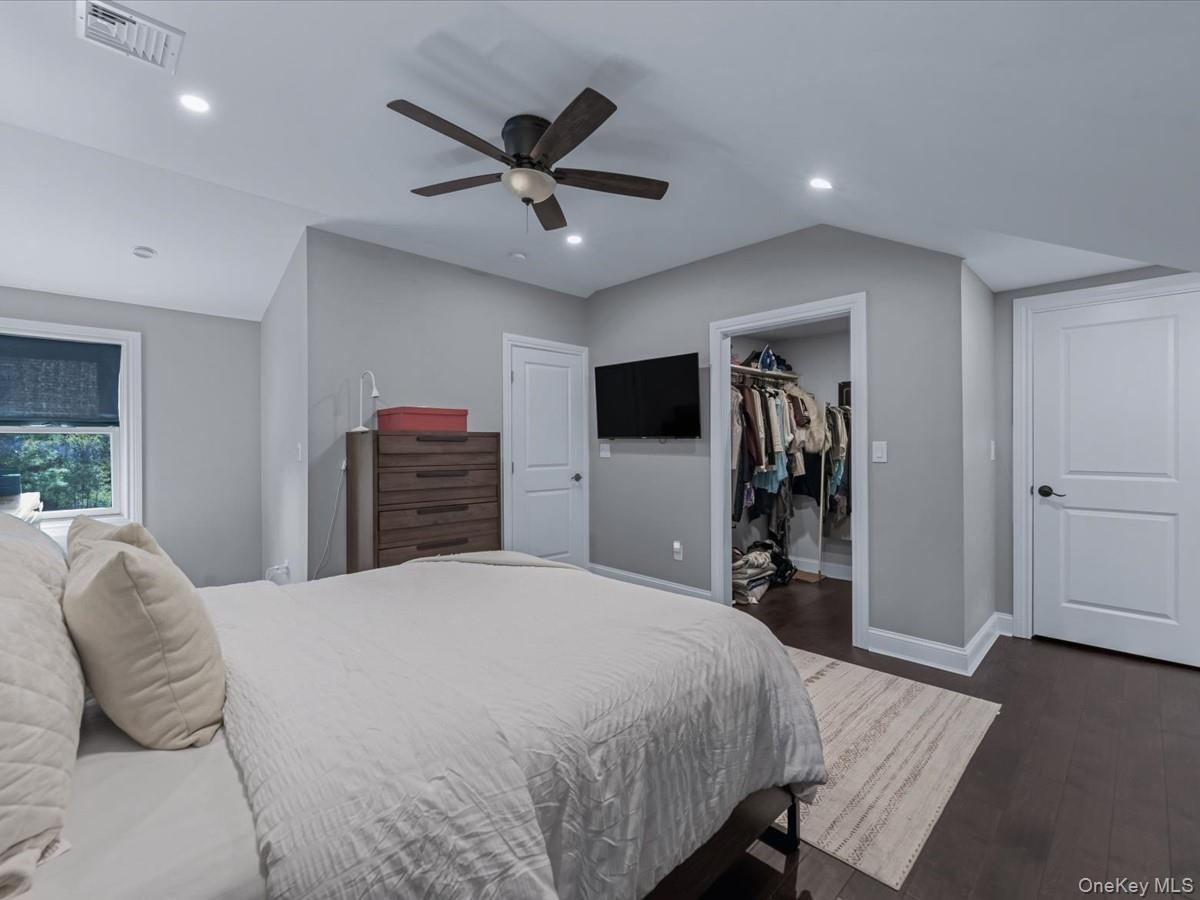 - Bedroom with dark wood-style floors, a walk in closet, recessed lighting, lofted ceiling, and ceiling fan