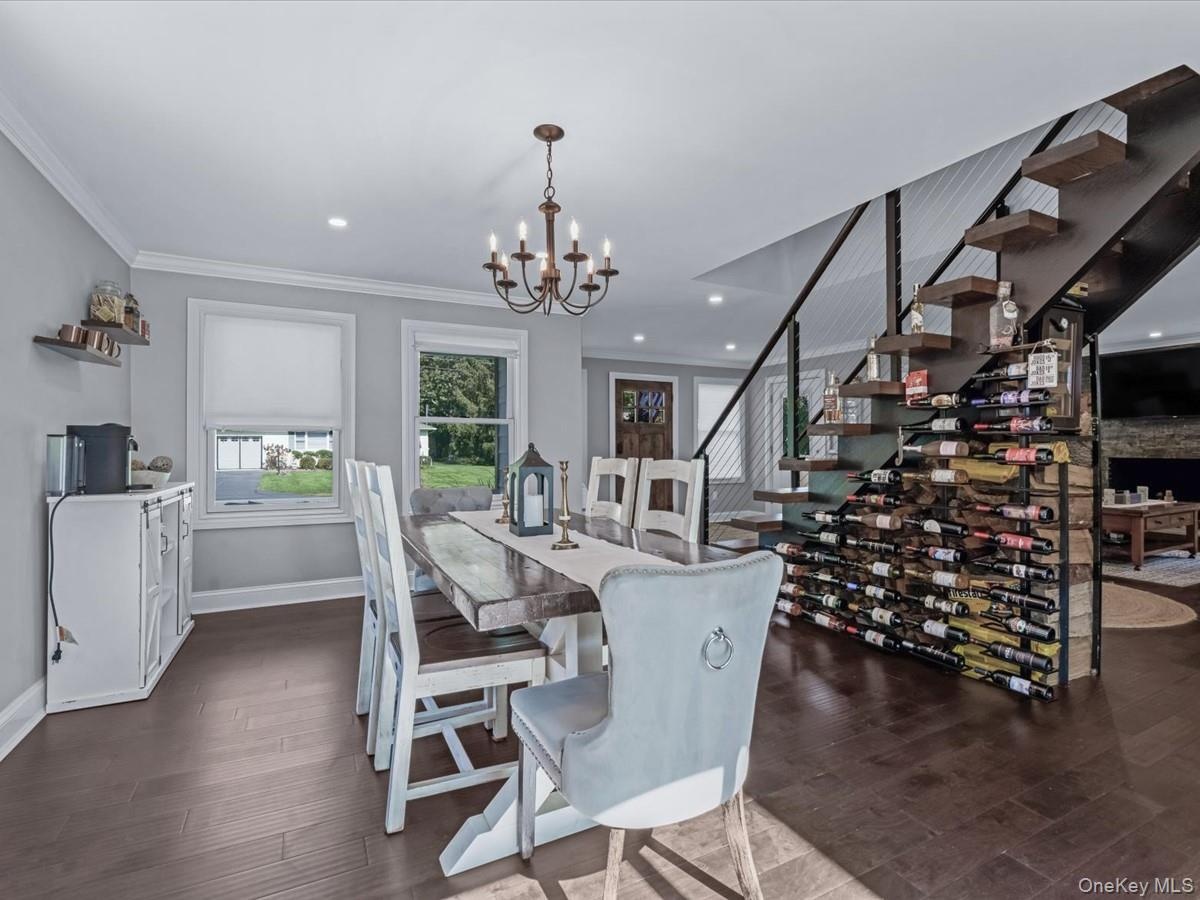 - Dining space with stairs, dark wood finished floors, ornamental molding, a chandelier, and recessed lighting