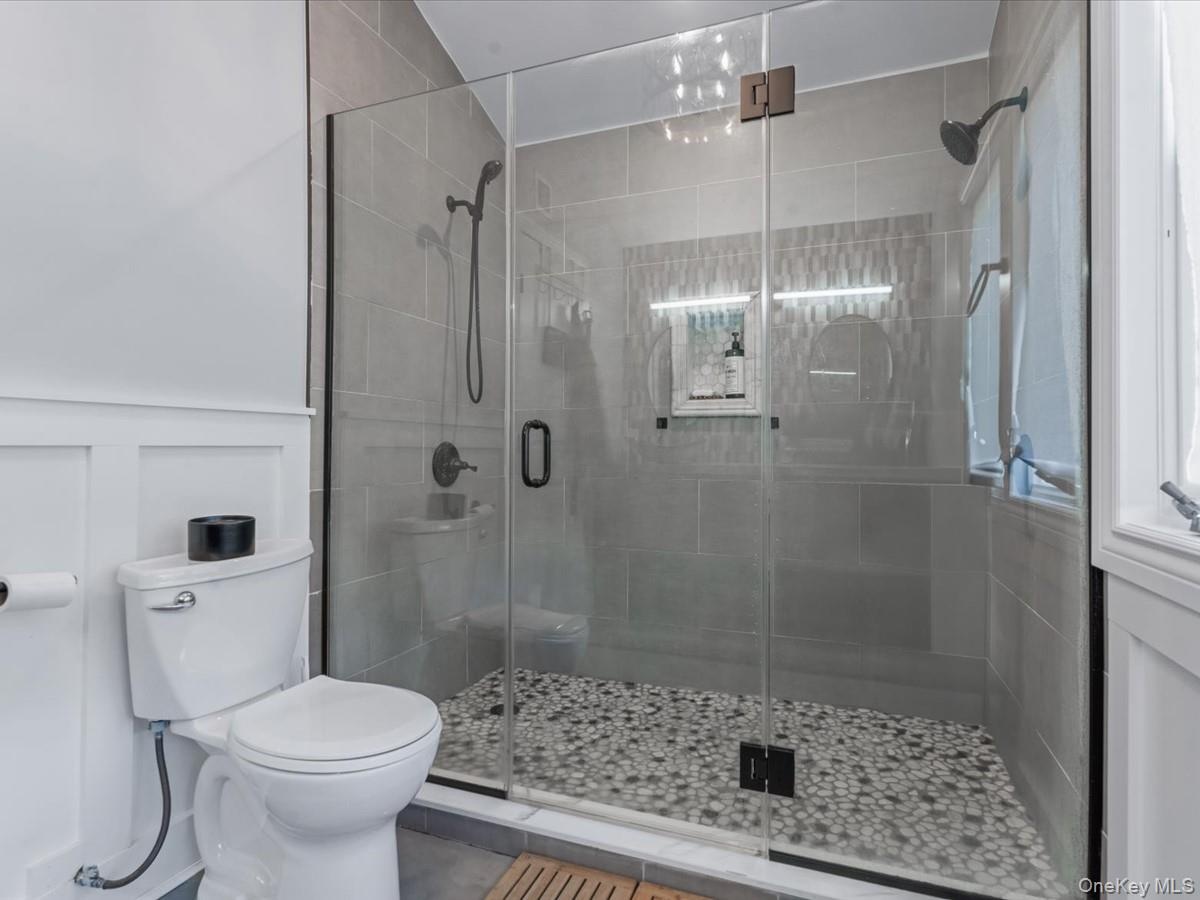 - Full bath with a stall shower, a wainscoted wall, a decorative wall, and tile patterned floors