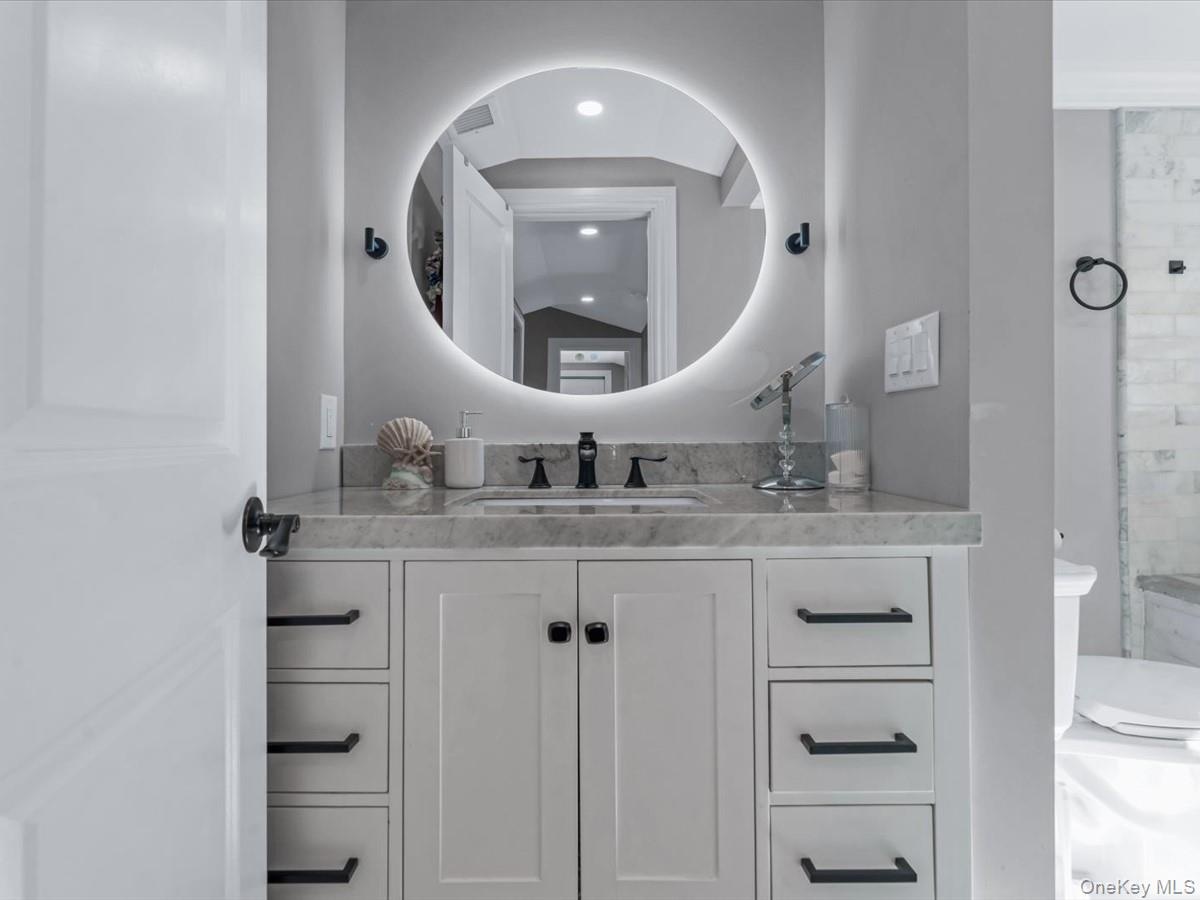 - Full bathroom featuring vanity, lofted ceiling, and a tile shower