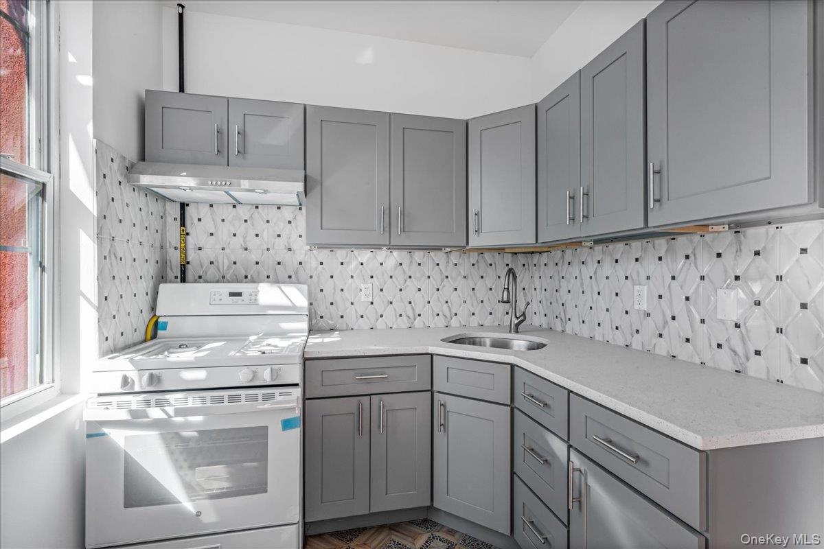 - Kitchen featuring gray cabinetry, white range, backsplash, and under cabinet range hood