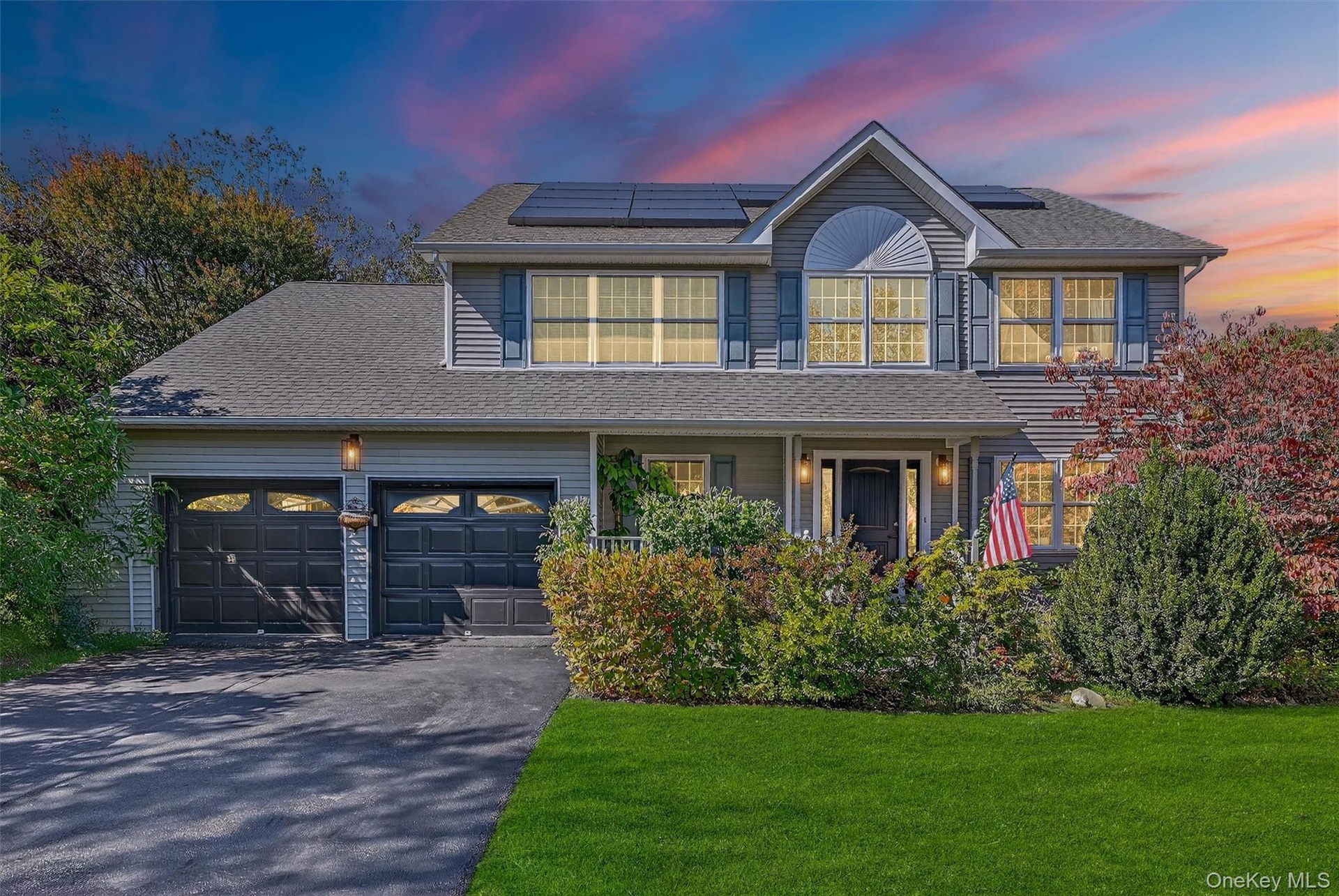- Traditional-style house with driveway, roof with shingles, and roof mounted solar panels