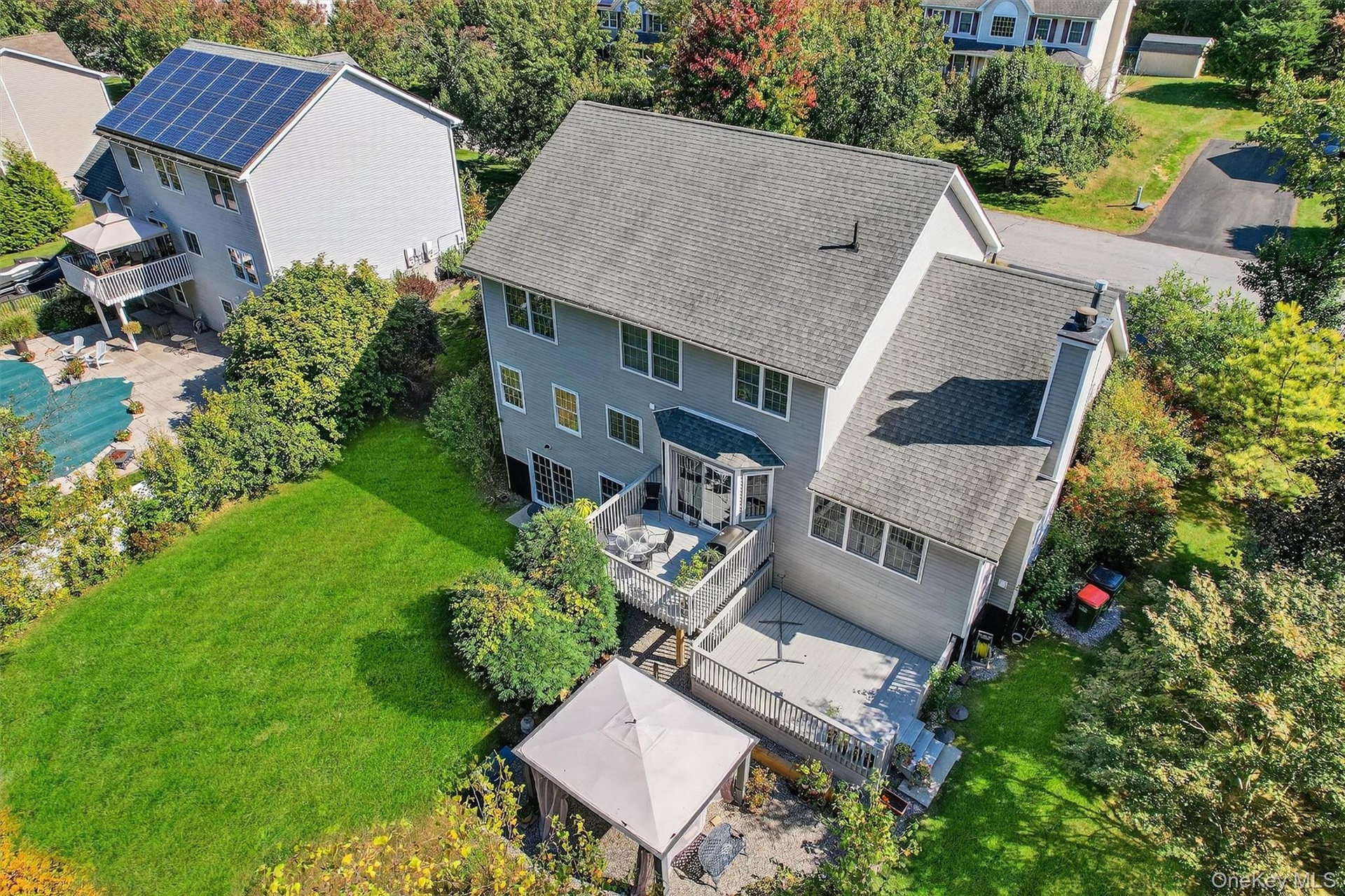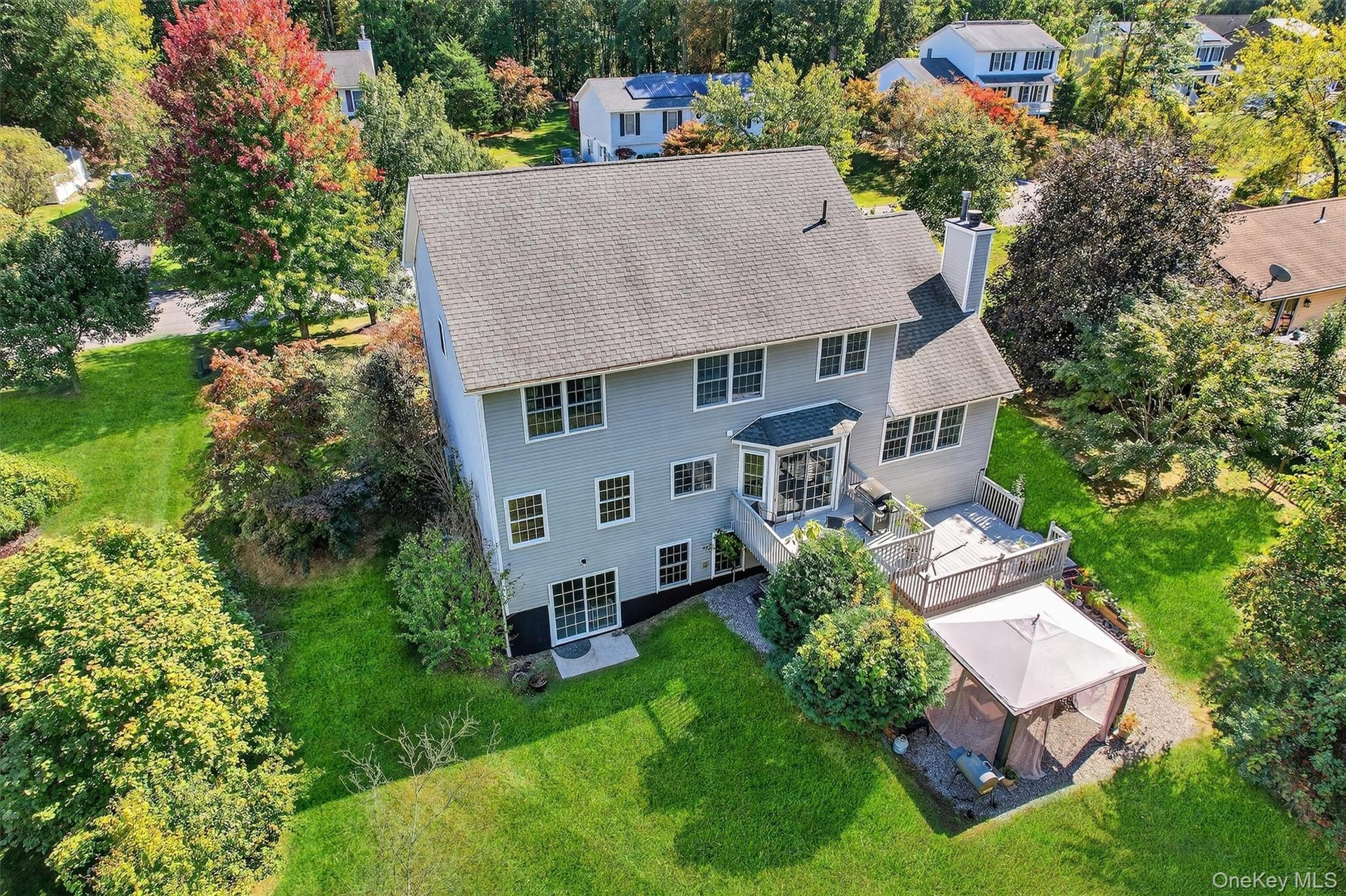 Welcome to this beautifully maintained home offering a spacious, light-filled layout designed for both comfort and style. The main level features a stunning eat-in kitchen with granite countertops, a classic tiled backsplash, stainless steel appliances, a pantry, and a generous center island — perfect for cooking, casual dining, and gathering. Seamlessly connected is the inviting living room with a cozy pellet stove fireplace, creating an ideal space for everyday living and entertaining. Elegant Bella wood hardwood floors flow throughout. The formal dining room exudes elegance with decorative molding and leads to sitting room, while a private main-level office offers flexibility for remote work or study. Upstairs, retreat to the oversized primary suite with dual walk-in closets (including a converted sitting room for extra closet space) and a spa-inspired bath with dual vanities, a jetted tub, and a separate shower. Three additional bedrooms and a full hall bath provide provide comfort and room to grow. Step outside to a private backyard with a spacious deck for relaxing or outdoor dining. A full unfinished walk-out basement offers endless possibilities for expansion, while energy-efficient solar panels help keep utility costs low. Ideally located just minutes to the Mid-Hudson Bridge, Poughkeepsie train station, shopping, dining, and all the Hudson Valley has to offer — this home is move-in ready and a must-see!
