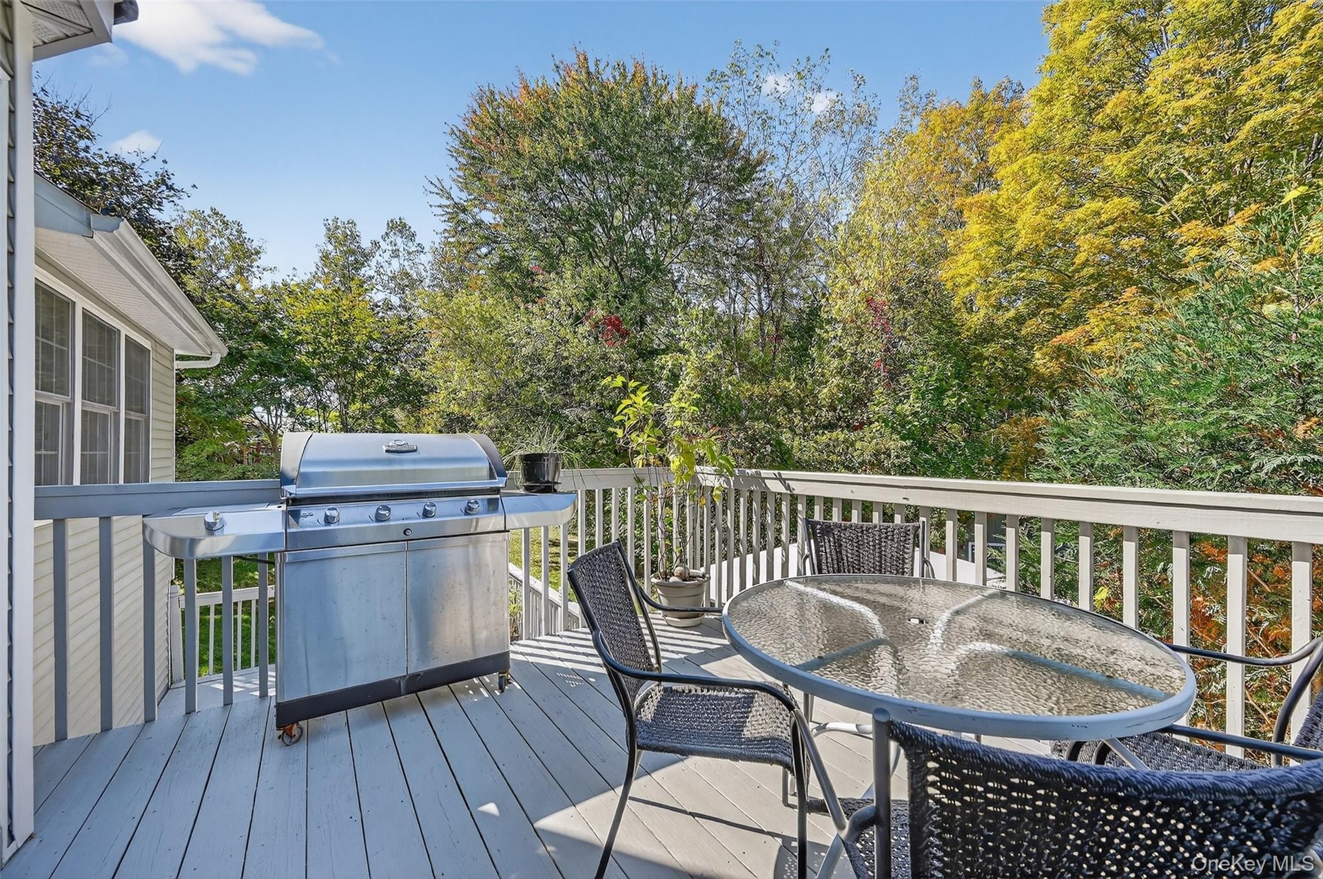 - Wooden terrace with a grill, outdoor dining area, and view of scattered trees