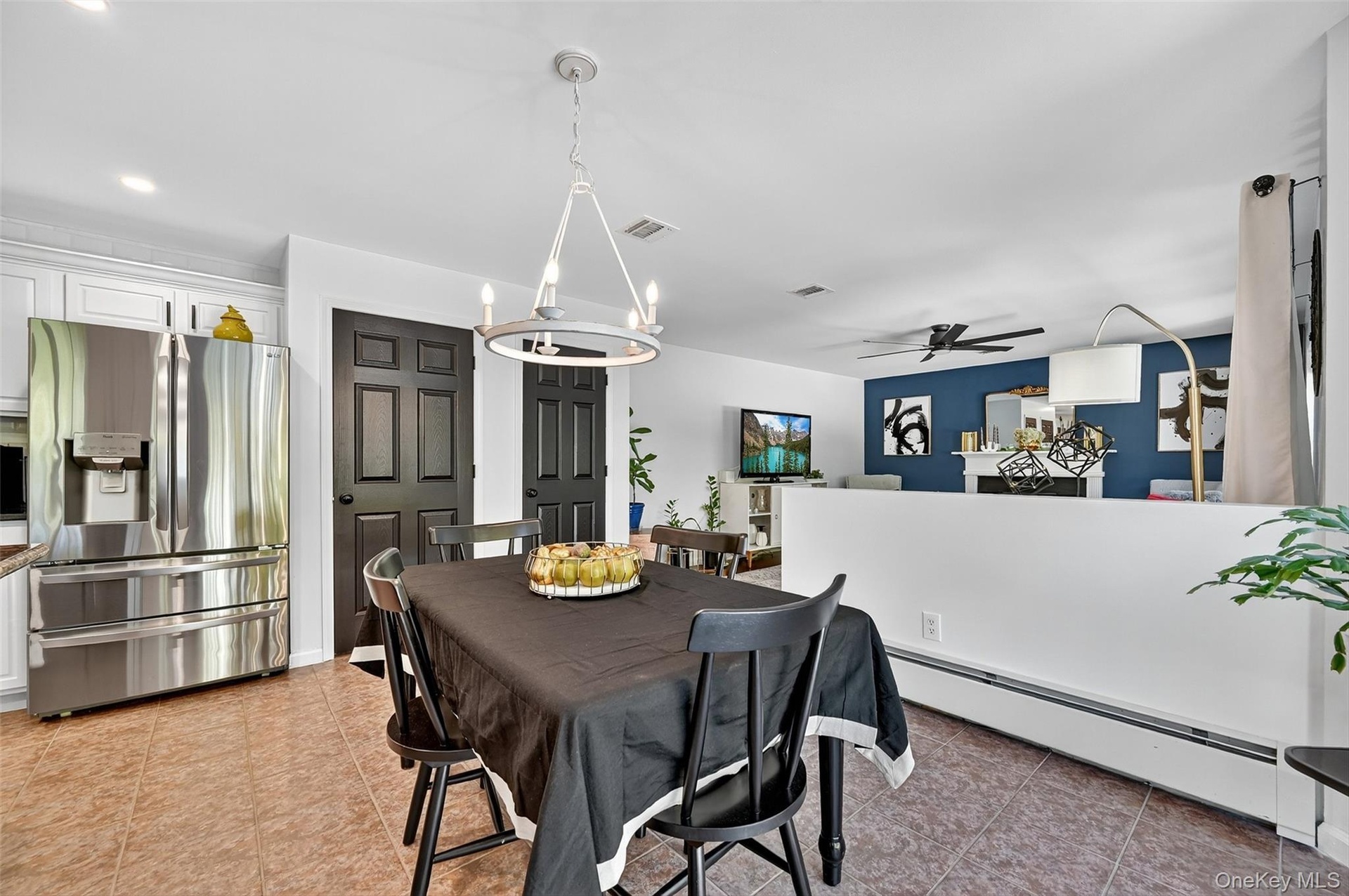 - Dining space with recessed lighting, baseboard heating, a chandelier, and light tile patterned floors