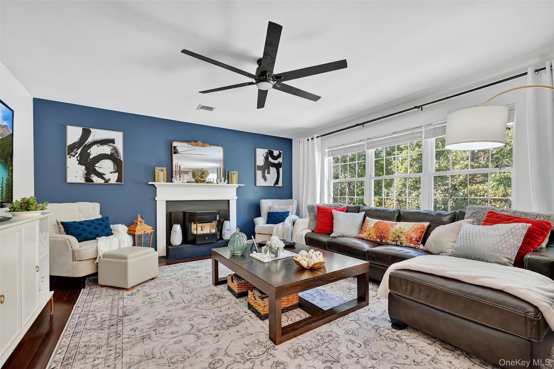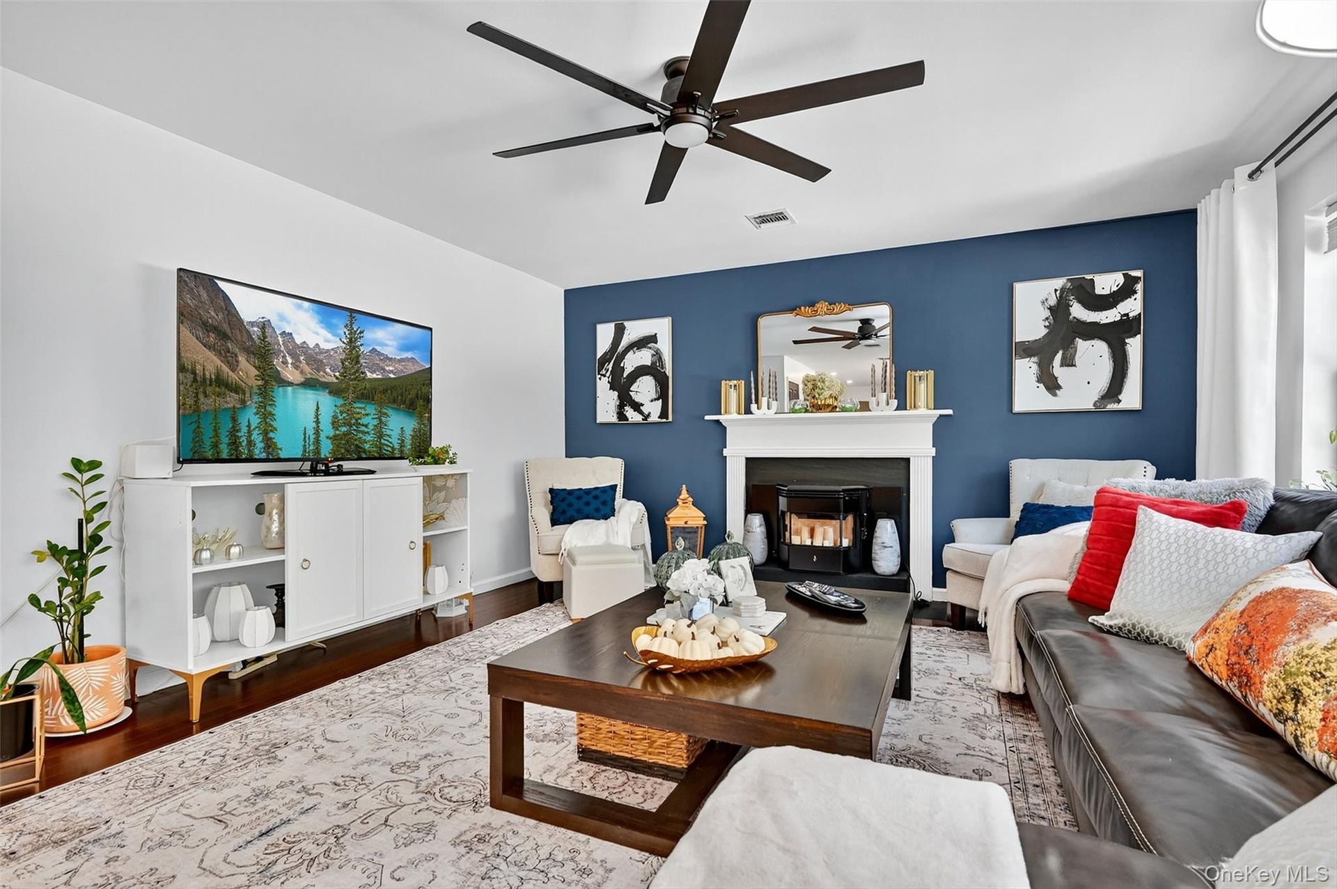 - Living room with a fireplace, a ceiling fan, and dark wood-style floors