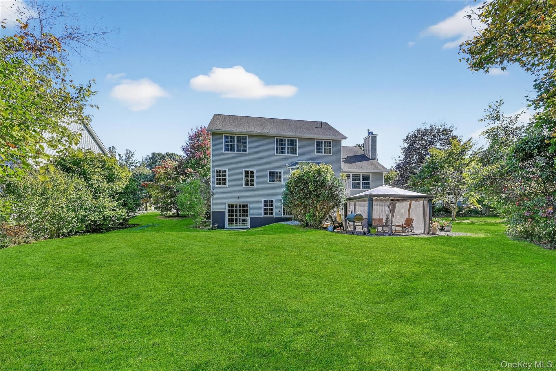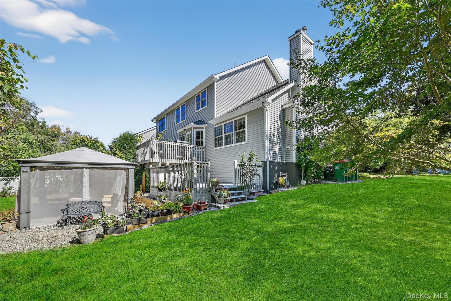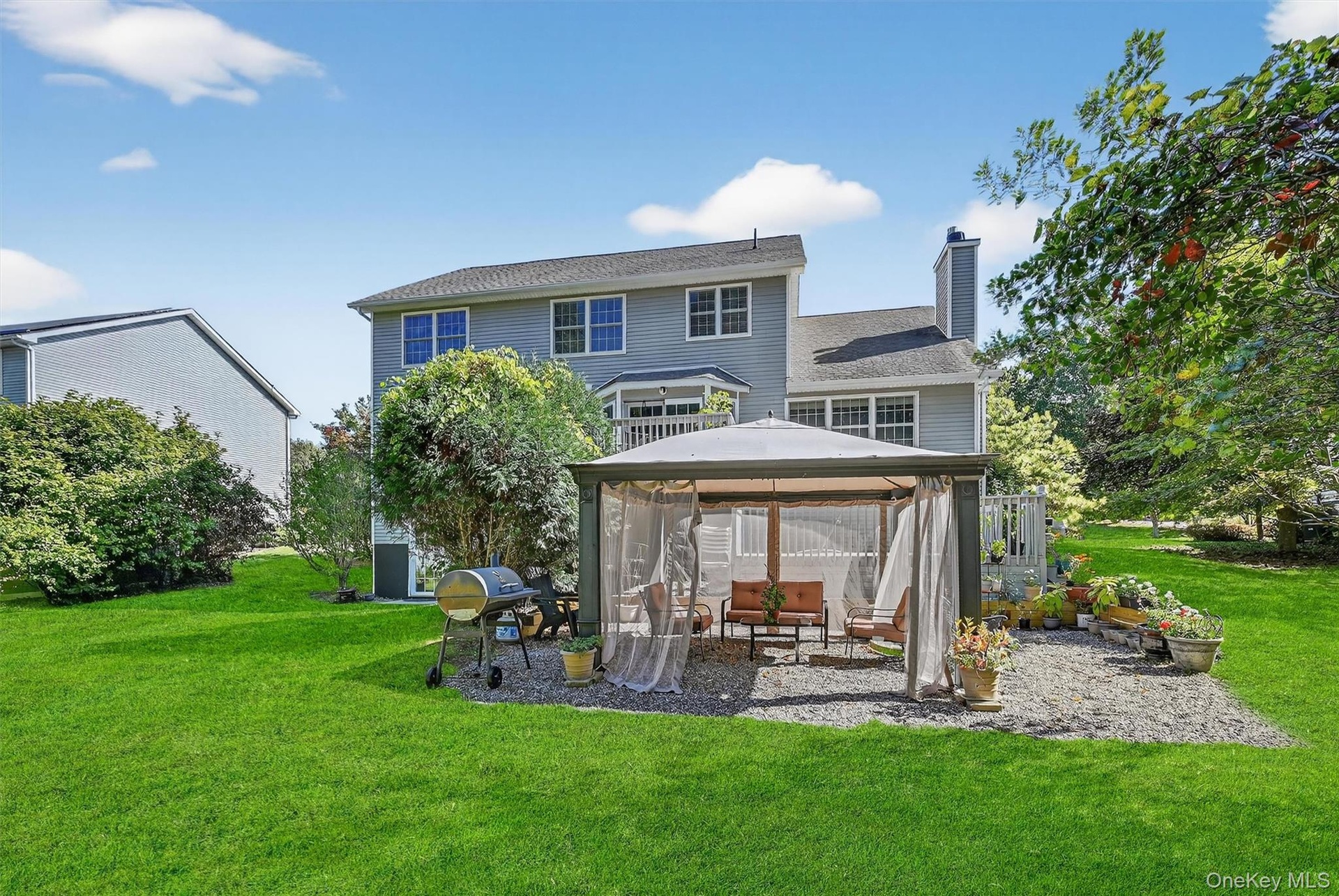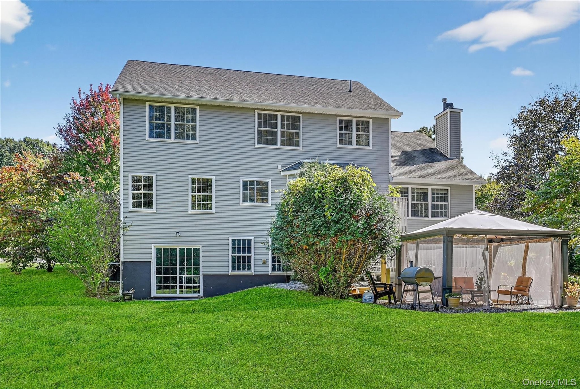 - Rear view of house with a lawn, a chimney, and a gazebo