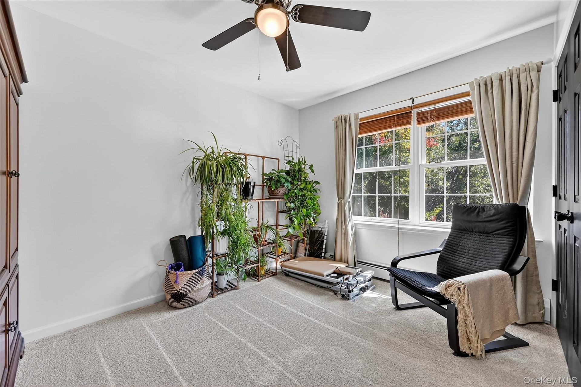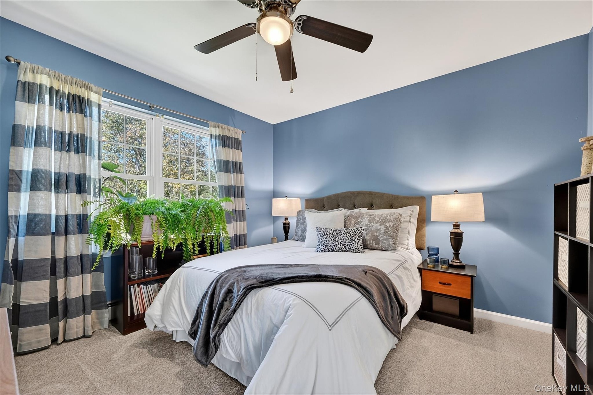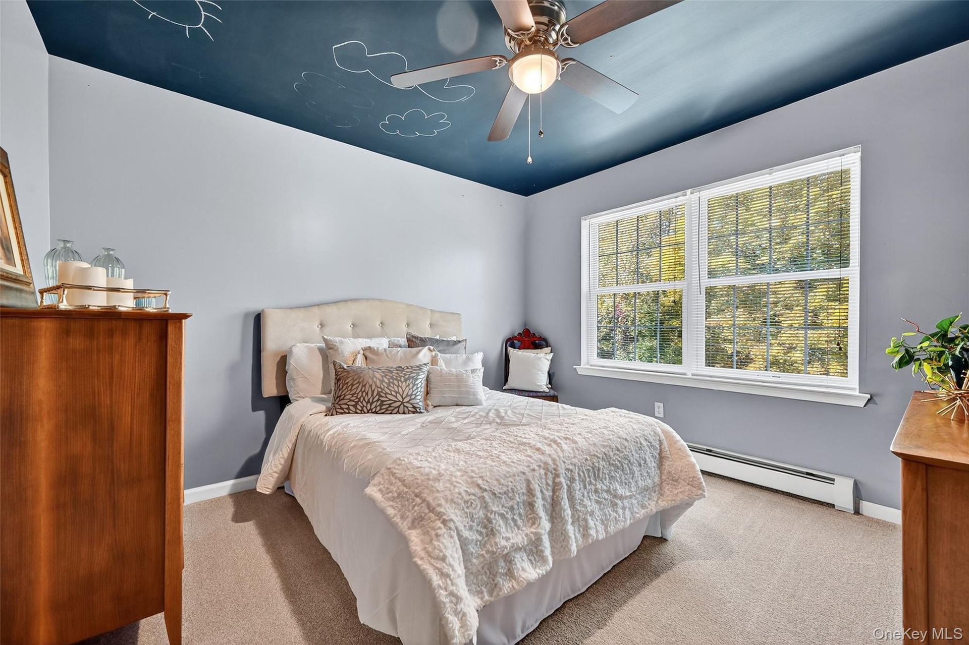 - Bedroom featuring carpet, a baseboard radiator, and a ceiling fan