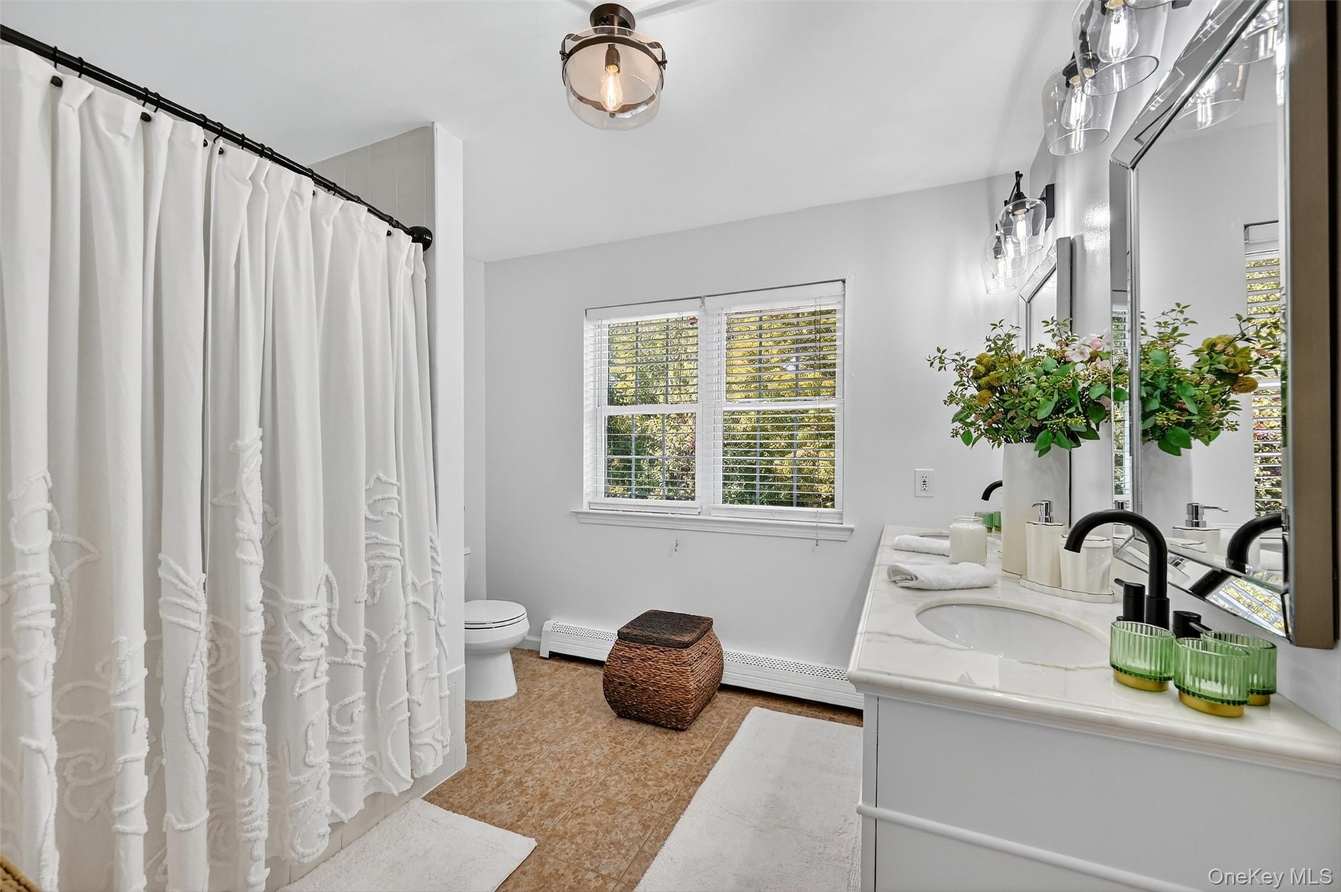 - Bathroom featuring double vanity, a baseboard heating unit, curtained shower, and baseboard heating