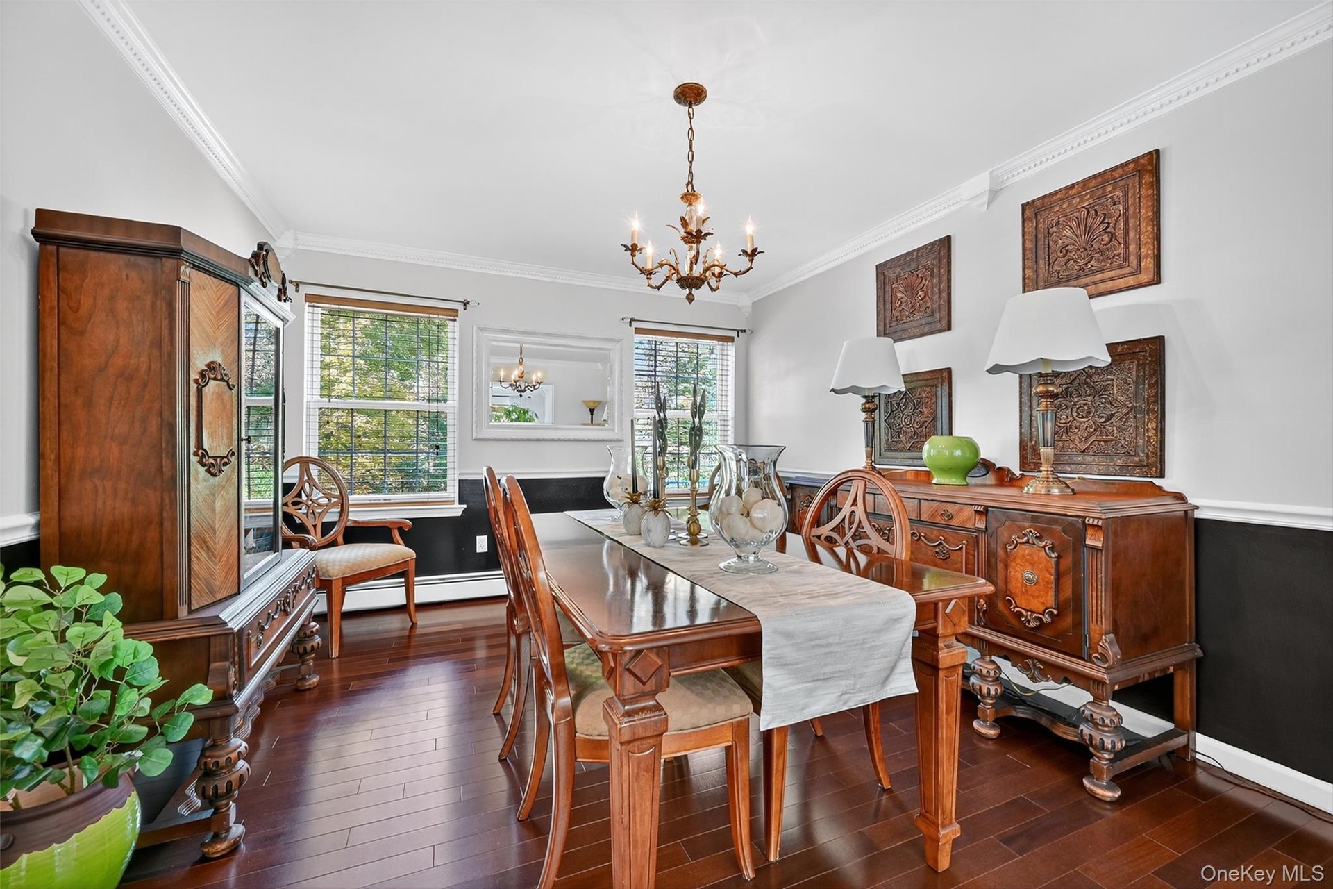 - Dining area featuring ornamental molding, a chandelier, dark wood-type flooring, baseboard heating, and wainscoting