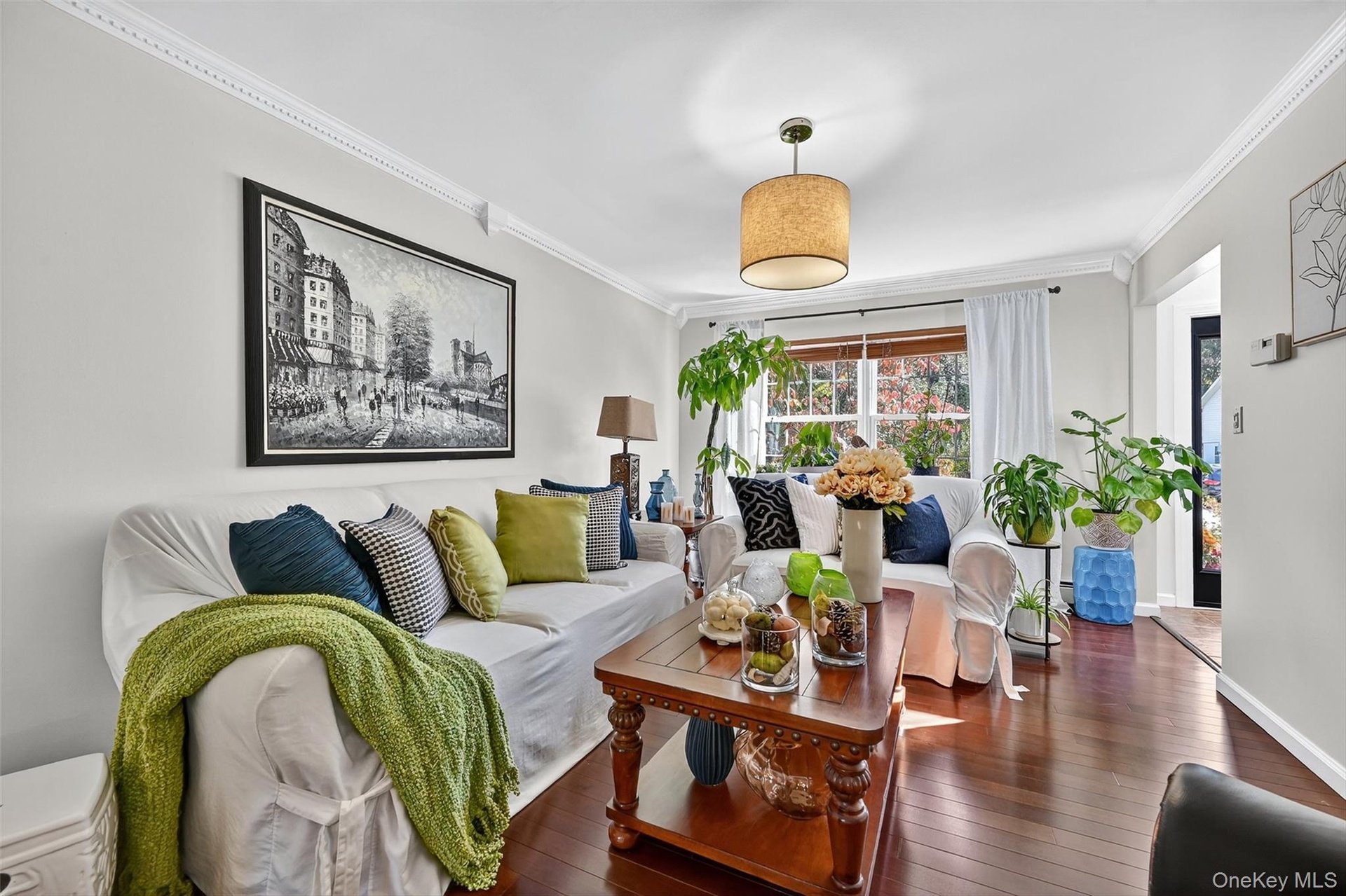 - Living area with ornamental molding and hardwood / wood-style flooring