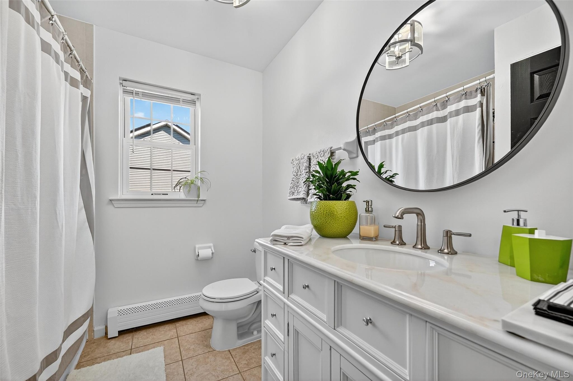 - Full bath with baseboard heating, vanity, light tile patterned floors, and a shower with curtain