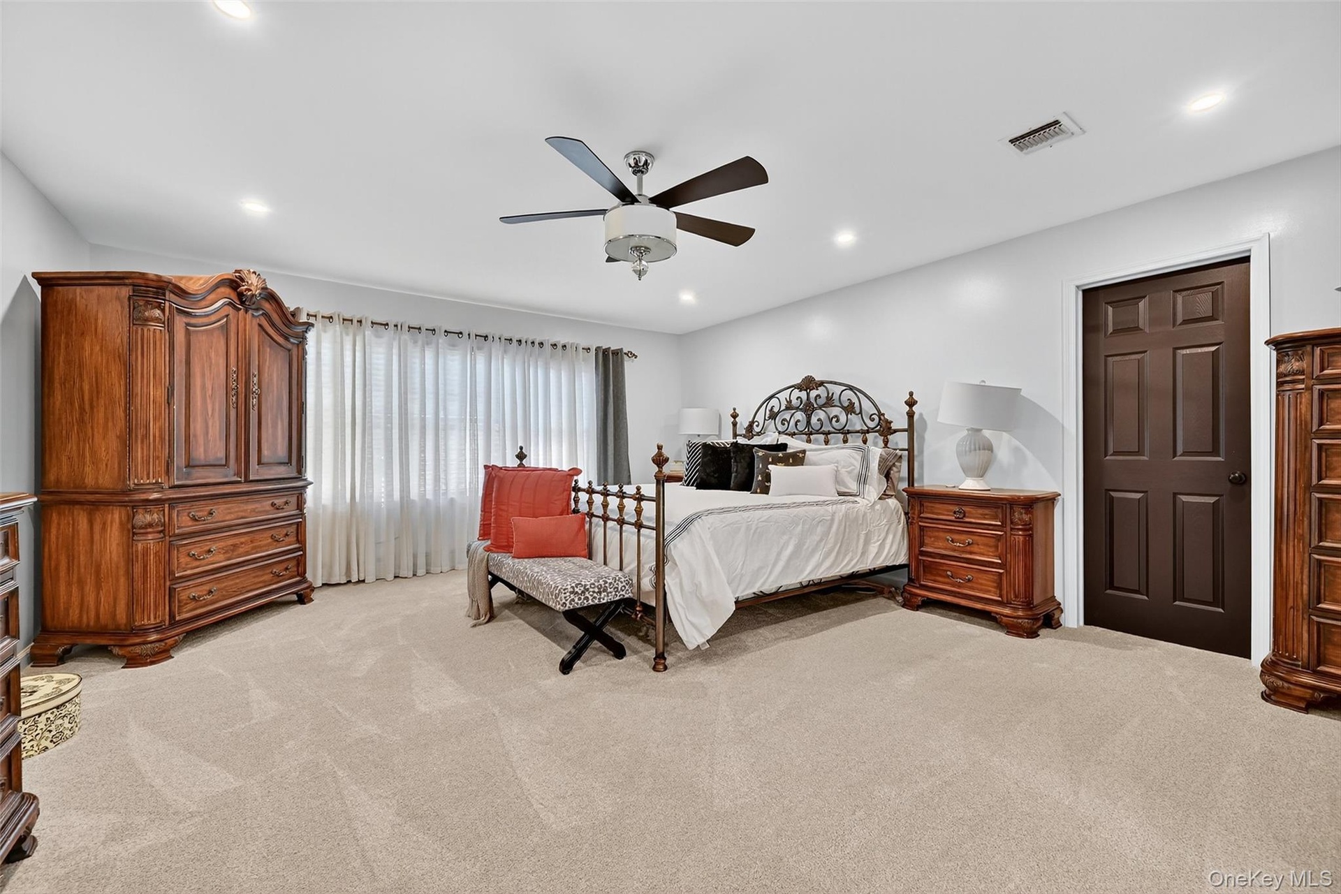 - Bedroom featuring light carpet, a ceiling fan, and recessed lighting
