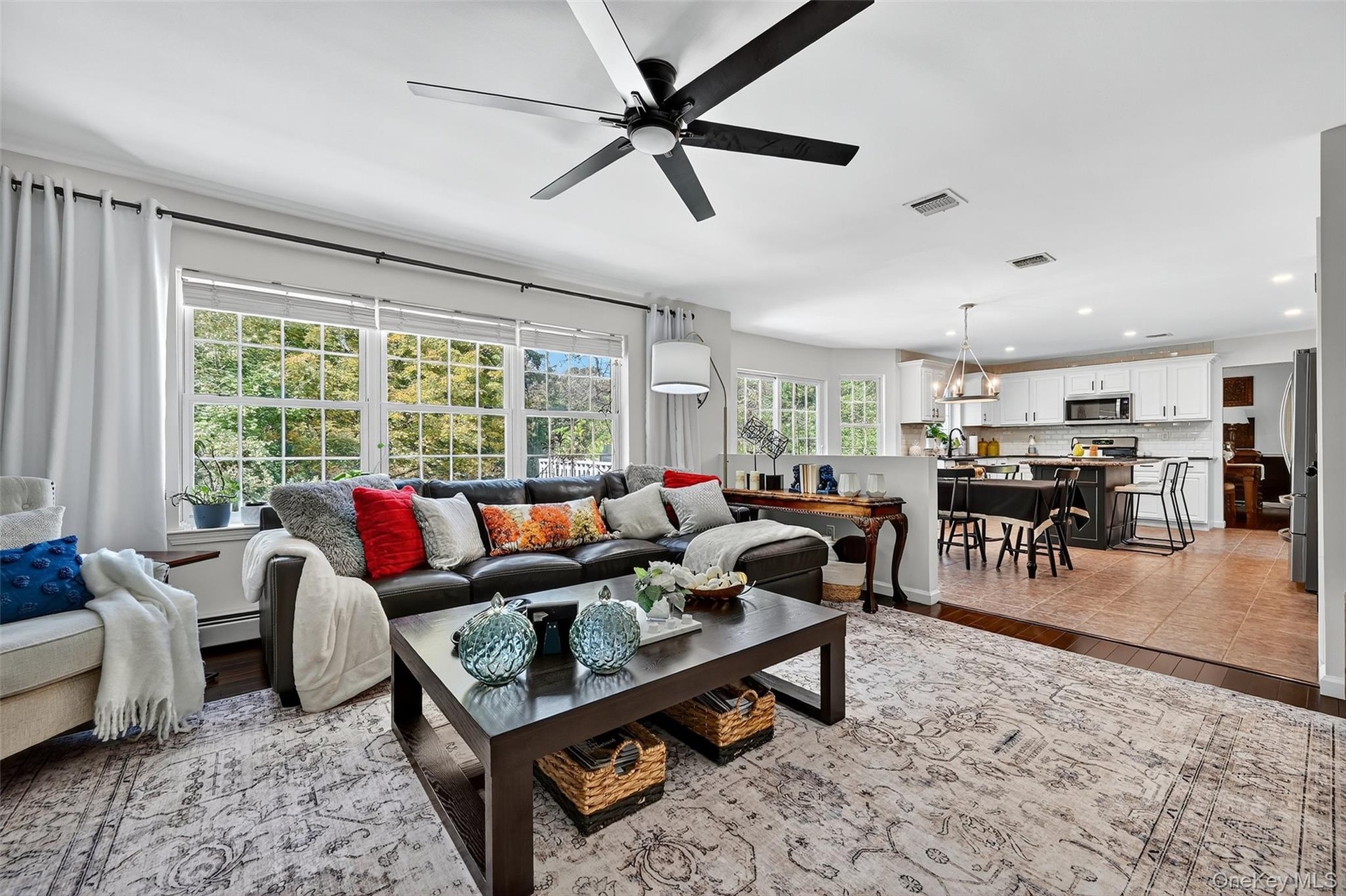 - Living room featuring light wood-style flooring, ceiling fan, recessed lighting, a baseboard heating unit, and a chandelier
