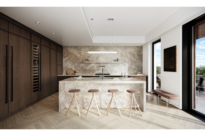 European white-oak chevron floors are a signature element of the entertaining spaces, while a coat closet frames the entry. The bedroom boasts generous proportions that can easily accommodate a king-size bed set. The bathroom has a deep soaking tub, radiant heated floors, and features honed Spanish Dekton slab. Every element is finished with elegant Waterworks fixtures, creating the perfect retreat.