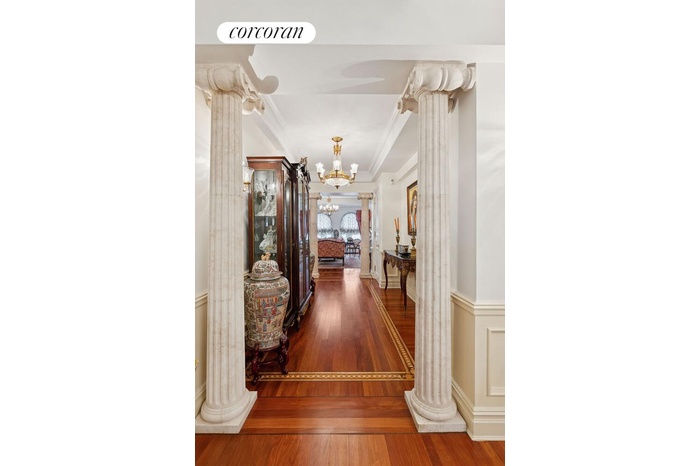 The entry opens into a gracious central foyer, flanked by custom-fabricated marble pillars that set the tone for this exceptional space. Throughout, the floors are finished with exquisite bordered inlays and ornamental medallions, providing an added layer of artistry and sophistication.