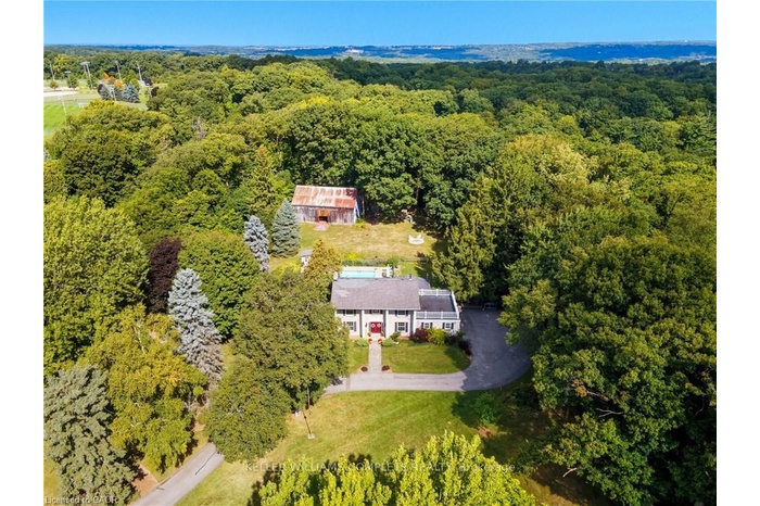 RARE OPPORTUNITY!!! This property is truly unique. It can be your dream family home on 2.4 acres w/ land & a barn surrounded by Conservation land while still being central to all the amenities of Ancaster & it has potential development opportunity. Set back from the road & surrounded by mature trees this home provides privacy & tranquility. There is a special peaceful feeling when at this gorgeous property. The home begins w/ a grand foyer setting a tone of elegance from the moment you arrive. At the heart of the main floor is a newly remodeled modern farmhouse kitchen, dining room, sitting area by the wood stove & 2 separate living areas - a cozy living room w/ gas f/p & a family room perfect for a kids play area. A main floor office adds convenience for working or studying from home. Upstairs the spacious bedrooms provide privacy & comfort for the whole family. The finished basement extends the homes functionality w/ a flex space for a 4th bedroom, hobbies or gym. With a separate entrance the original home has a basement for storage & workbench area accessed from the garage. Outdoors this property is designed for family living & entertaining. The fenced-in pool w/ surrounding lounge areas creates a true summer retreat while the expansive fenced yard gives children & pets space to play safely. A charming barn adds both character & versatility whether for events, storage, hobbies or creative projects. The barn has running water w/ its own bathroom & septic bed. The barn has been used for 2 weddings & several large group events. Additional features include a double-car garage w/ inside entry, generous parking for 12 cars & during events lawn parking for approximately 50 cars. Attention developers, land investors, small business owners & anyone looking for the most beautiful lot you could imagine in city limits. This is more than a house - its a family retreat designed for making memories, celebrating milestones & enjoying the best of Ancaster living!