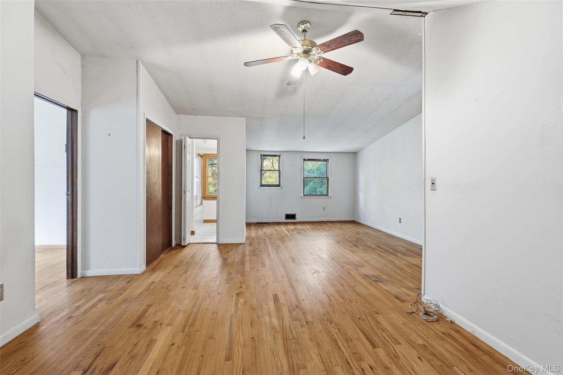 - Unfurnished living room featuring light wood finished floors and a ceiling fan