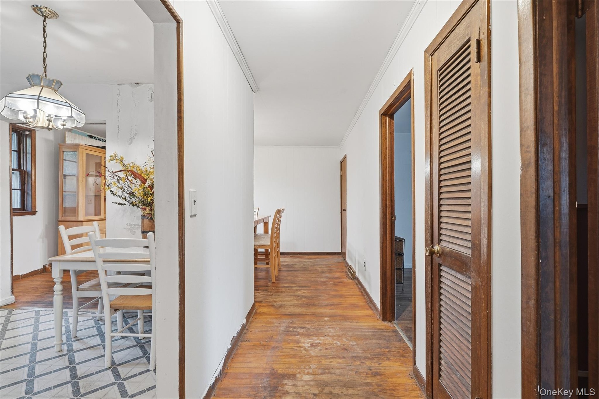 - Corridor featuring ornamental molding, hardwood / wood-style floors, and a chandelier