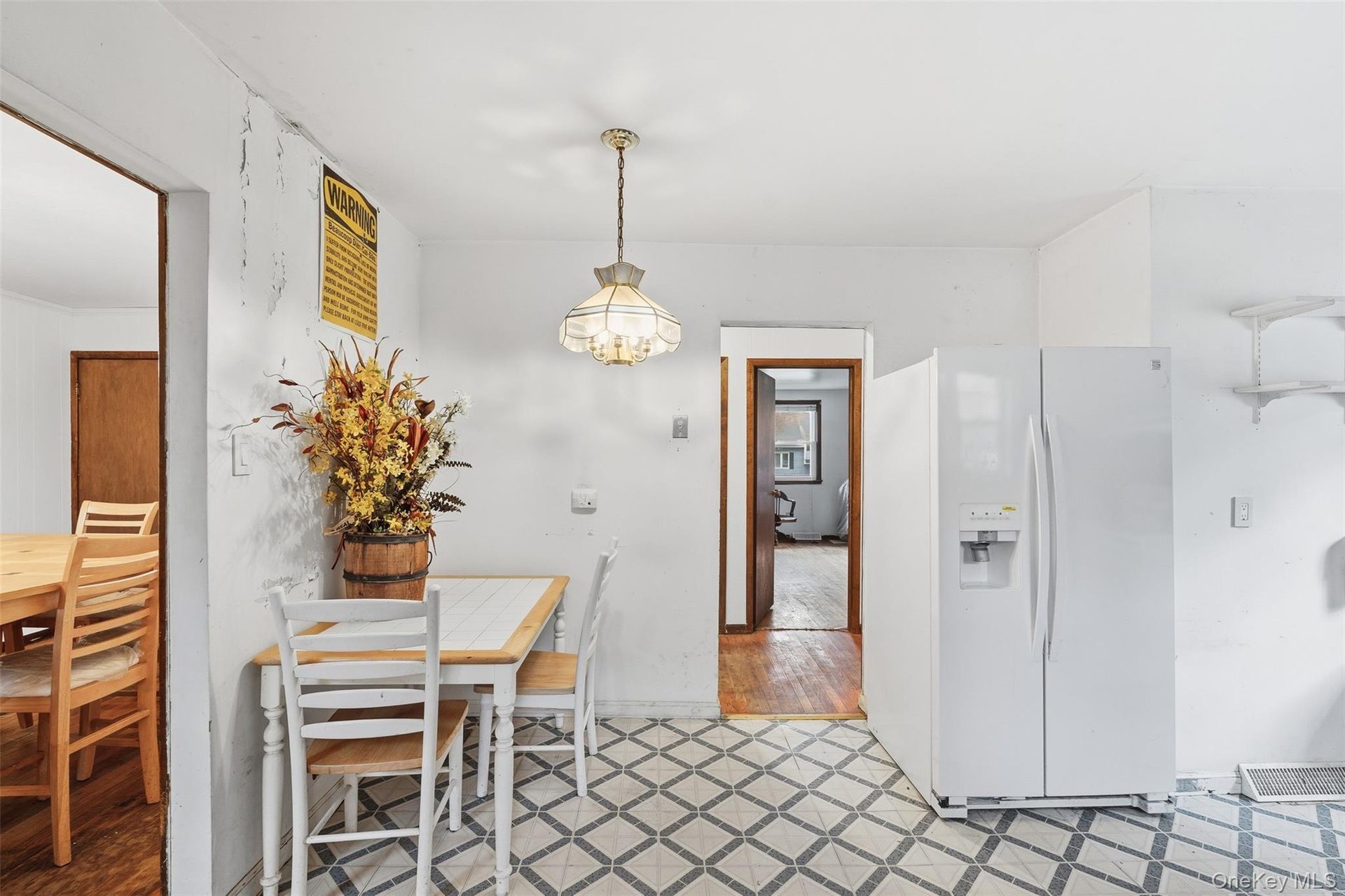 - Kitchen with white fridge with ice dispenser, dishwasher, decorative light fixtures, inlaid floor details, and blue cabinetry
