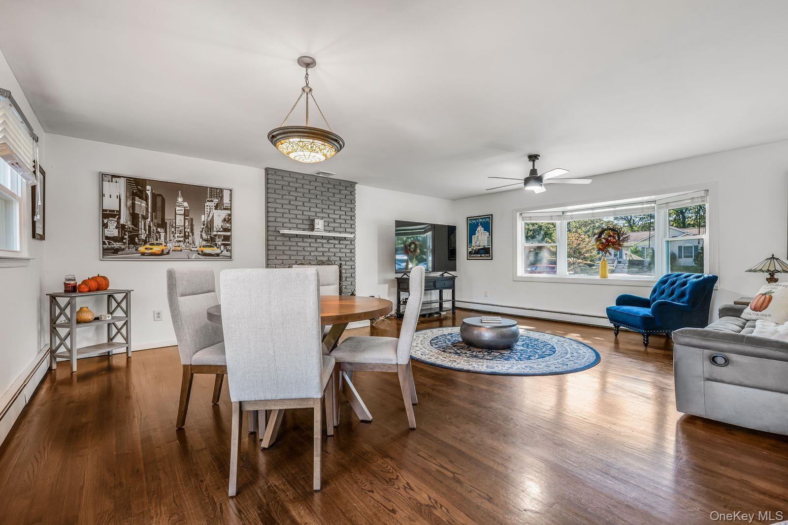 - Dining room with wood finished floors, a baseboard heating unit, and ceiling fan