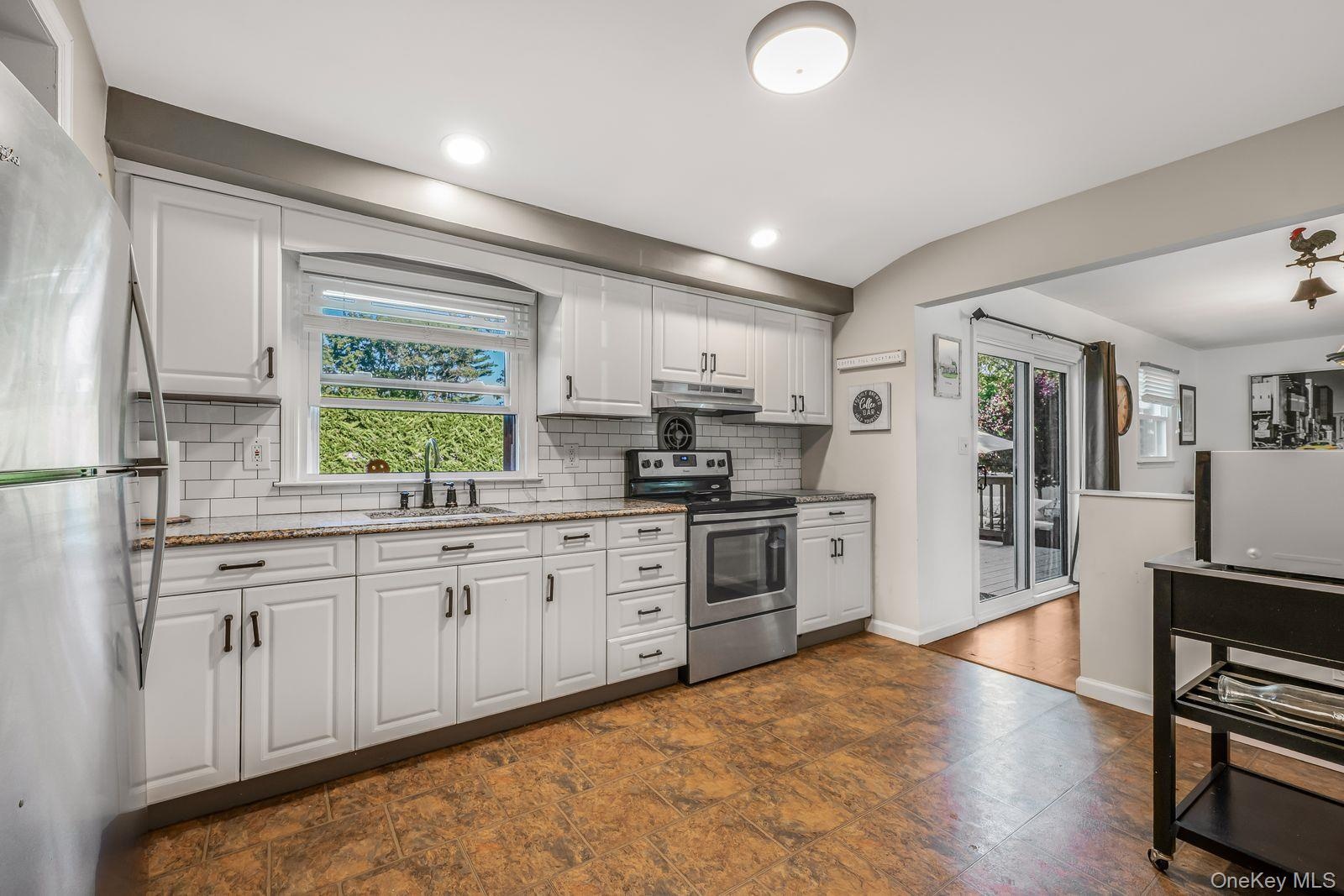- Kitchen featuring white cabinets, appliances with stainless steel finishes, backsplash, dark stone countertops, and recessed lighting