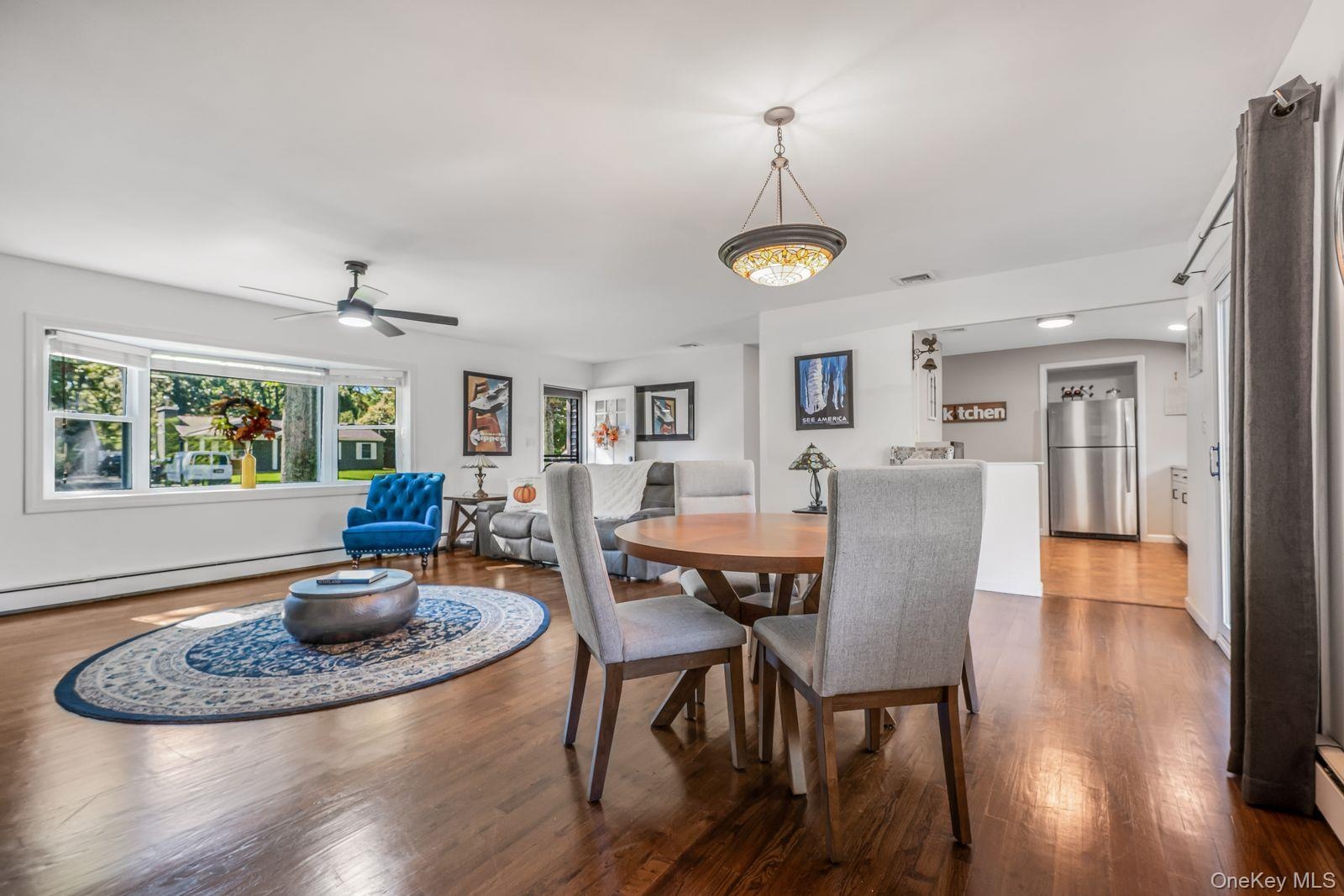 - Dining area with wood finished floors, baseboard heating, and ceiling fan