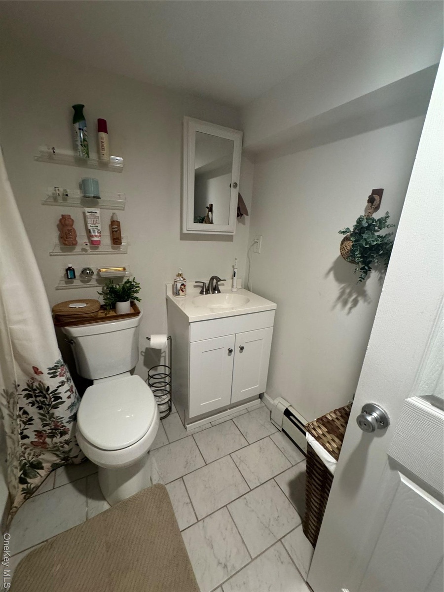 - Full bathroom featuring vanity and baseboard heating
