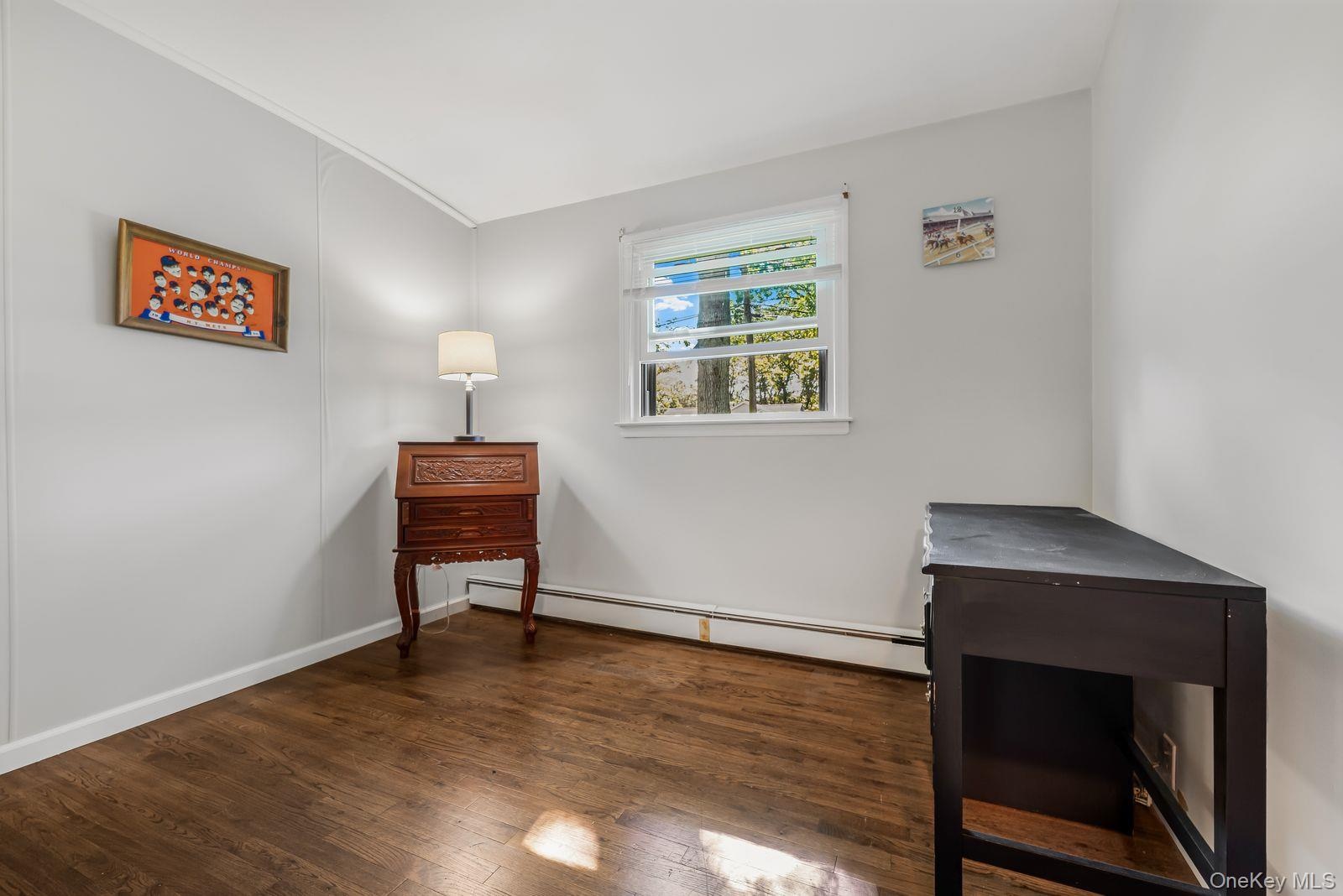 - Bedroom/Office with dark wood finished floors and a baseboard heating unit