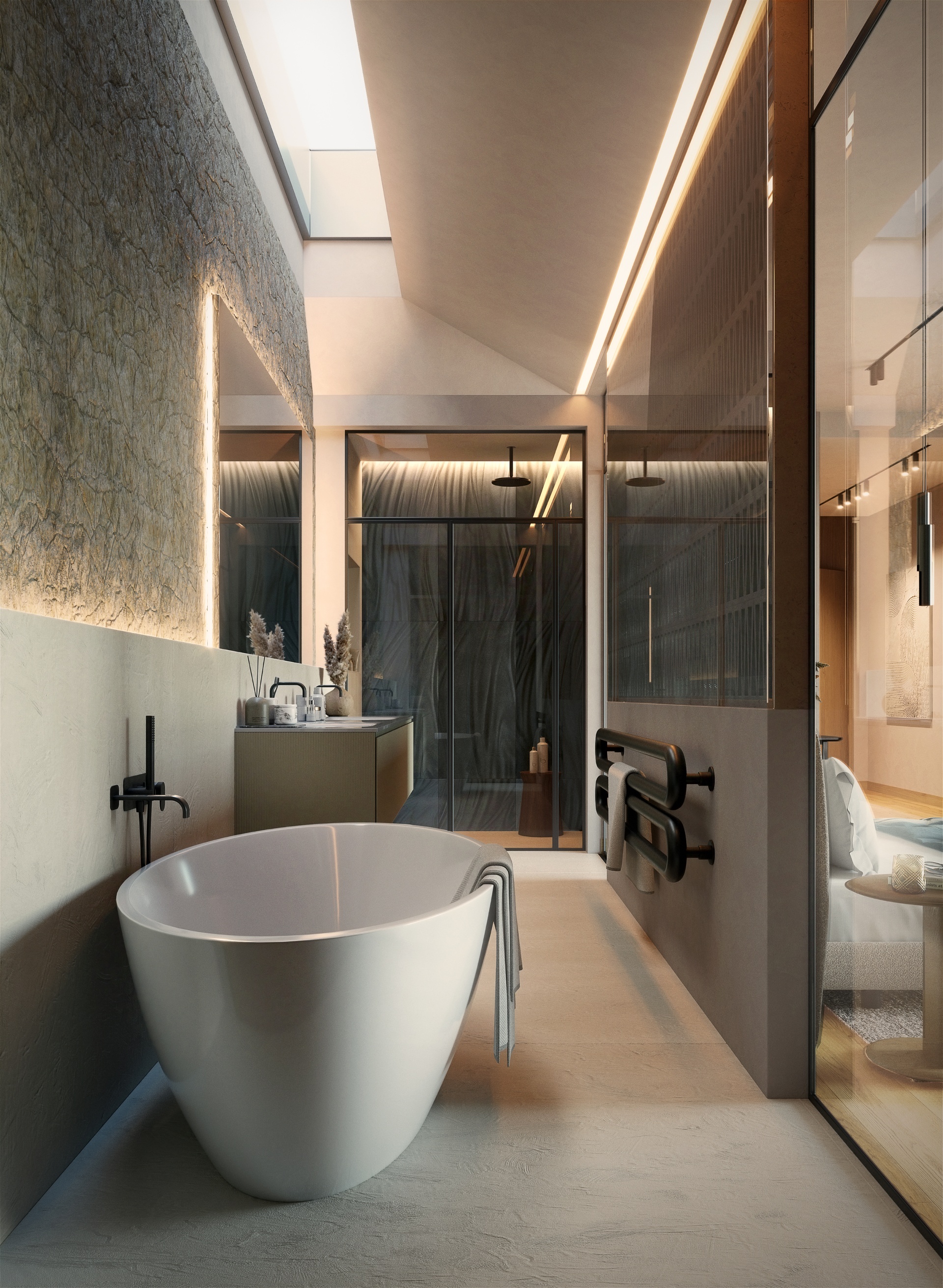 Designed to engage with their surroundings, the villas are centred around the outdoor living spaces, with floor-to-ceiling windows and doors which bathe the interiors with natural light throughout the day. Leading off large open plan living areas are bedroom suites, some with private terraces, offering quiet spaces to read or reflect. Contemporary, holistic interior design brings elements of the outside inside through the use of tactile materials, ergonomic furniture and lush green planting. Outside are generous, landscaped terraces, ideal for family and friends to gather to dine al fresco.