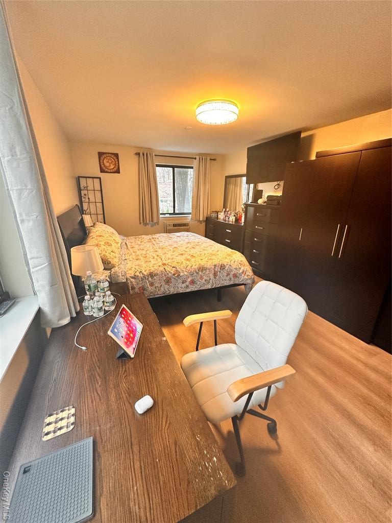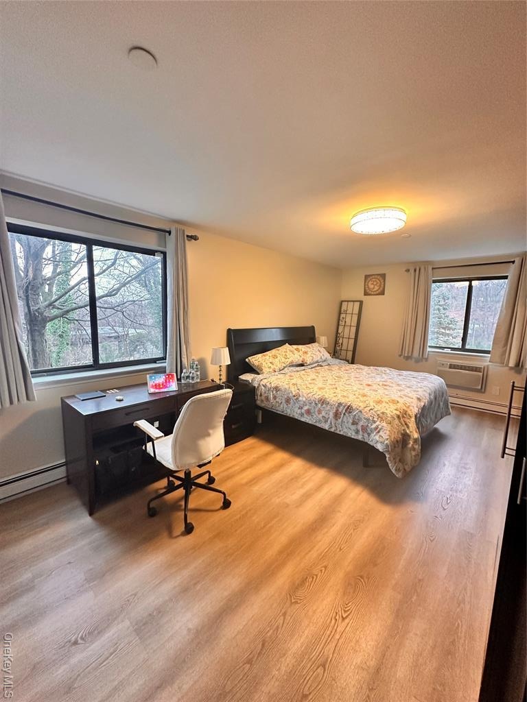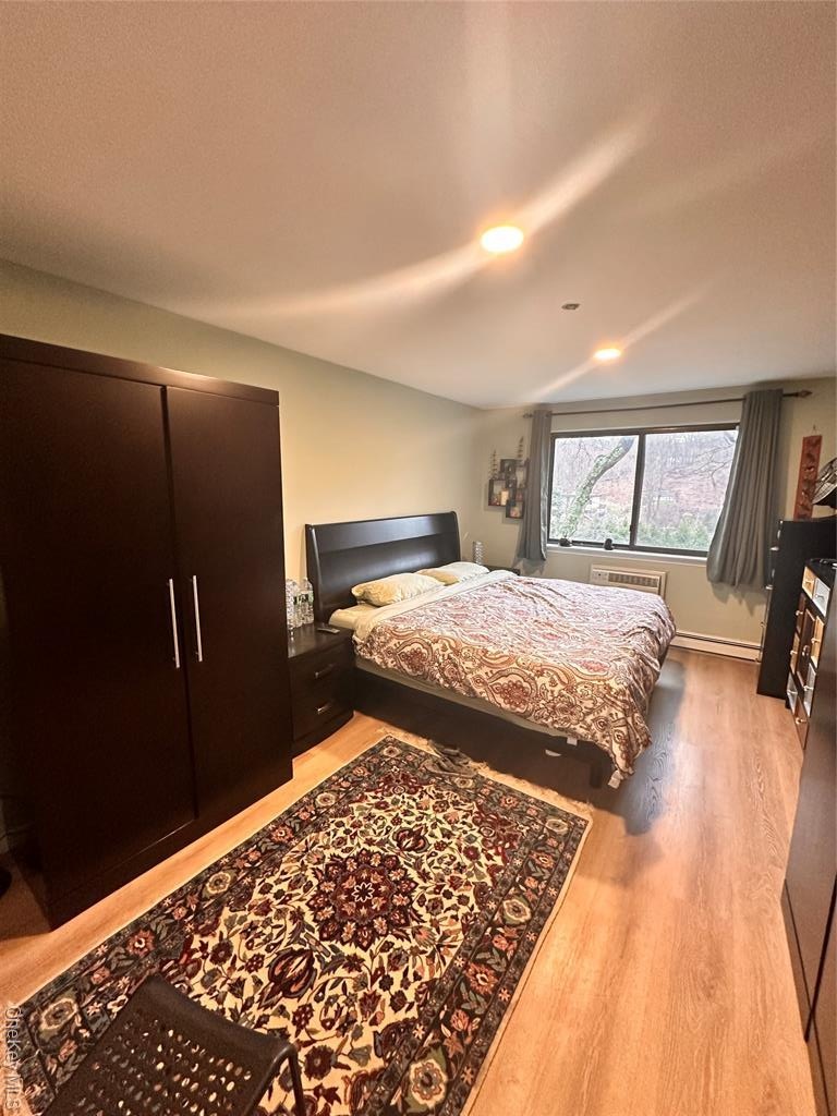- Bedroom with light wood-type flooring and a baseboard radiator