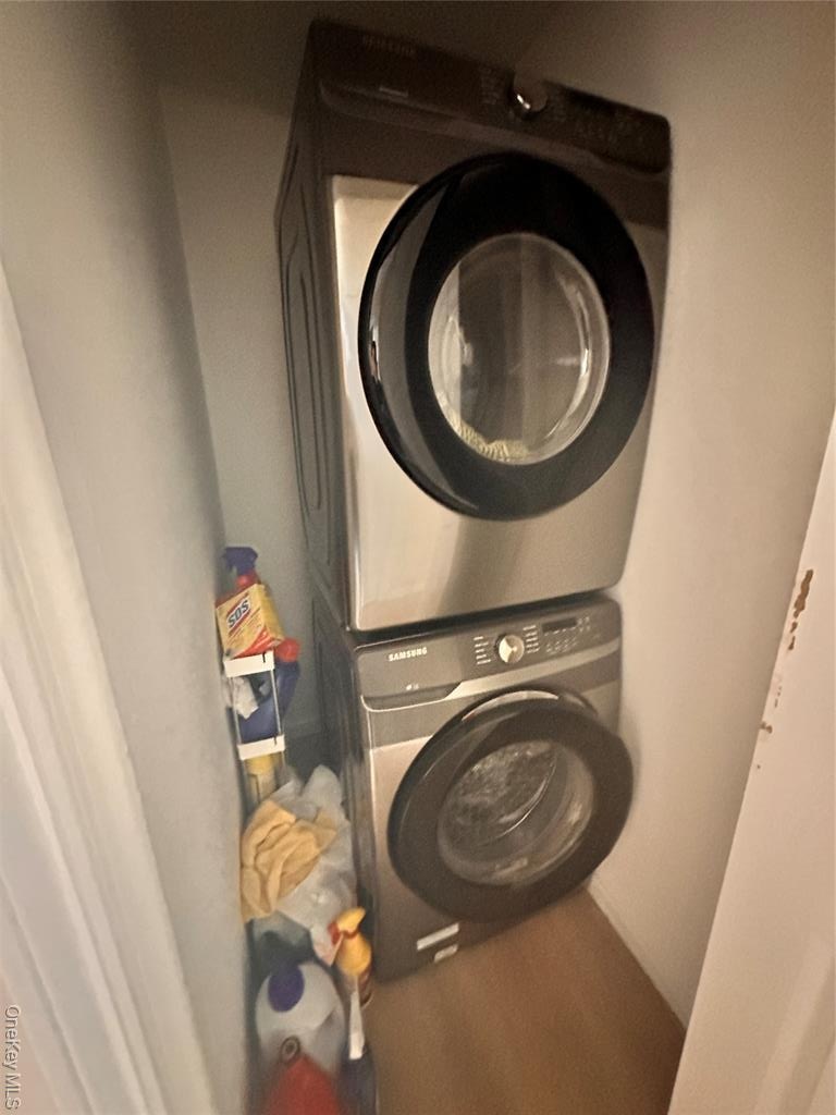 - Laundry room featuring stacked washer / drying machine and wood finished floors